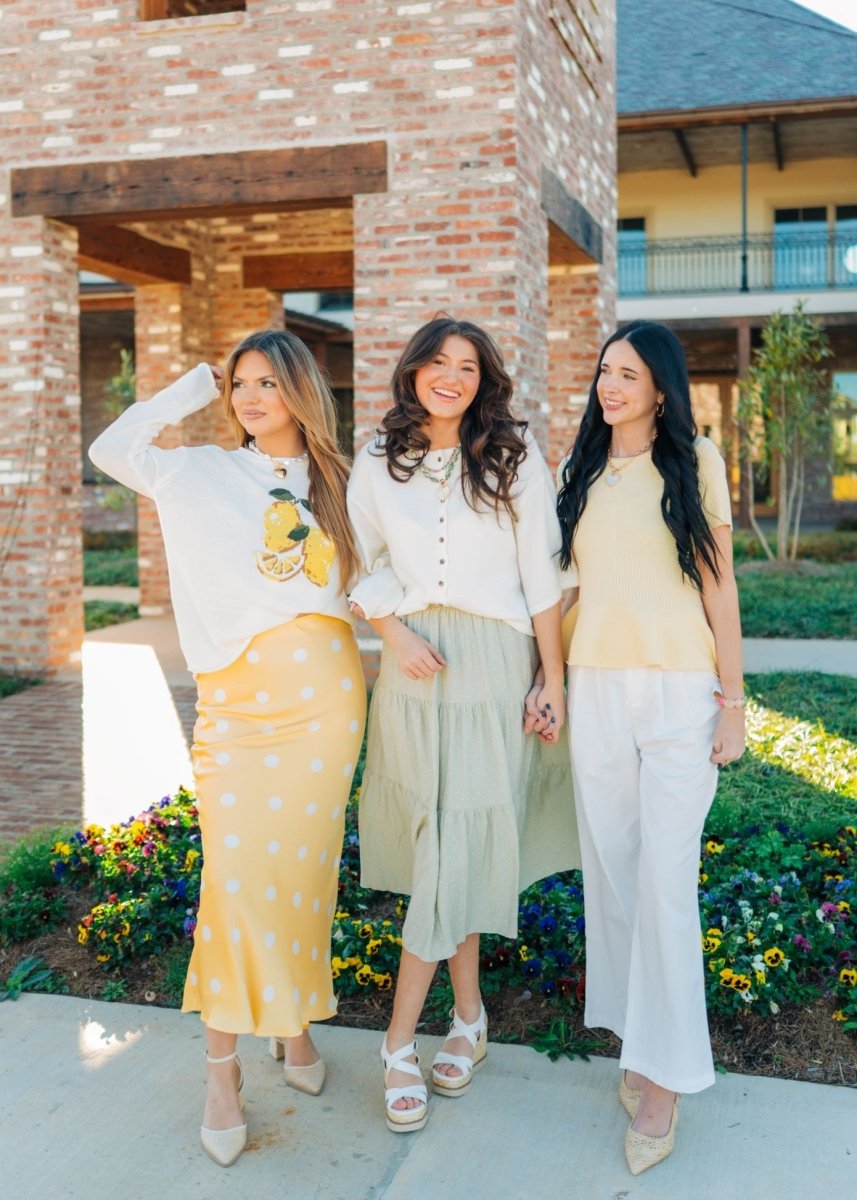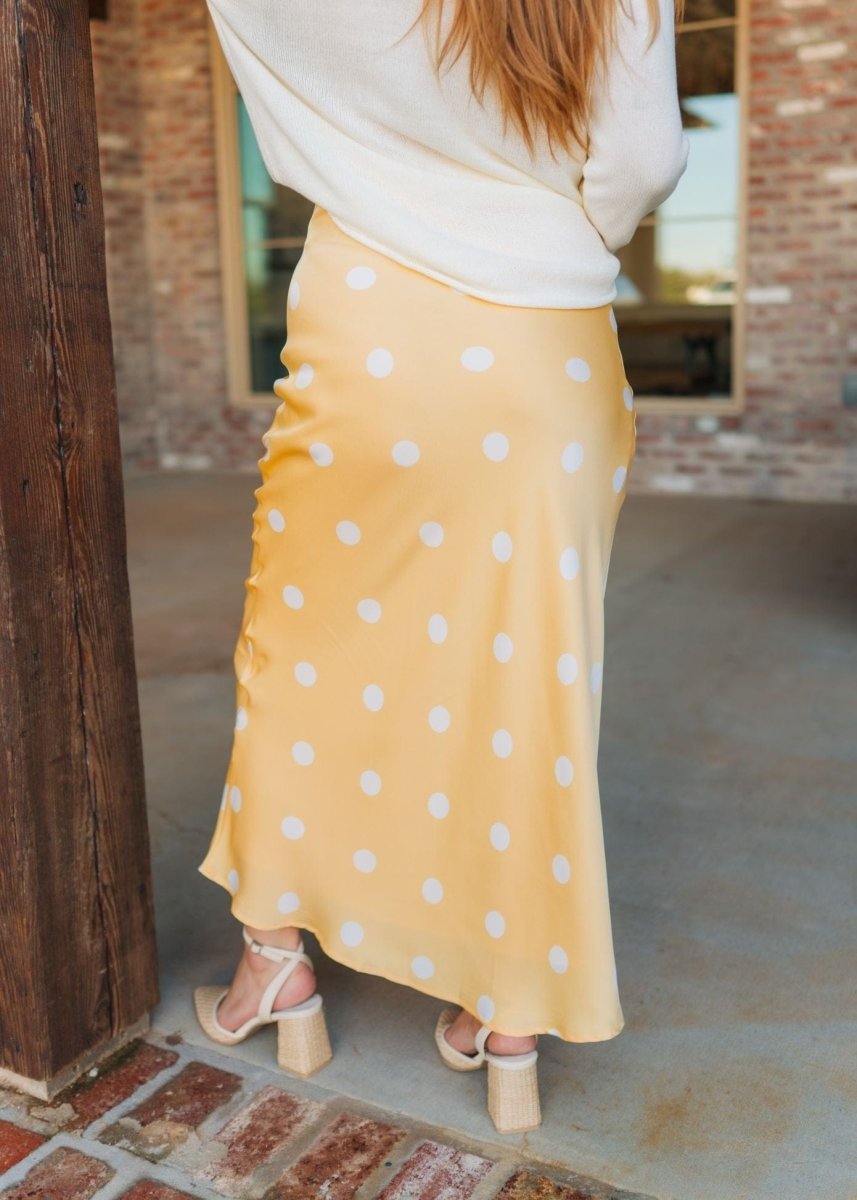 Elevate your spring wardrobe with this stunning yellow satin maxi skirt, featuring charming polka dots that capture effortless elegance. The flowing silhouette drapes beautifully while the elastic waist ensures all-day comfort and a flattering fit. Perfect for brunch dates, garden parties, or transitional layering, this trendy piece pairs seamlessly with crop tops, fitted blouses, or delicate cardigans. The luxe satin finish catches light beautifully, making it an instant standout in any seasonal rotation. A versatile essential that transforms from casual to sophisticated with minimal effort.