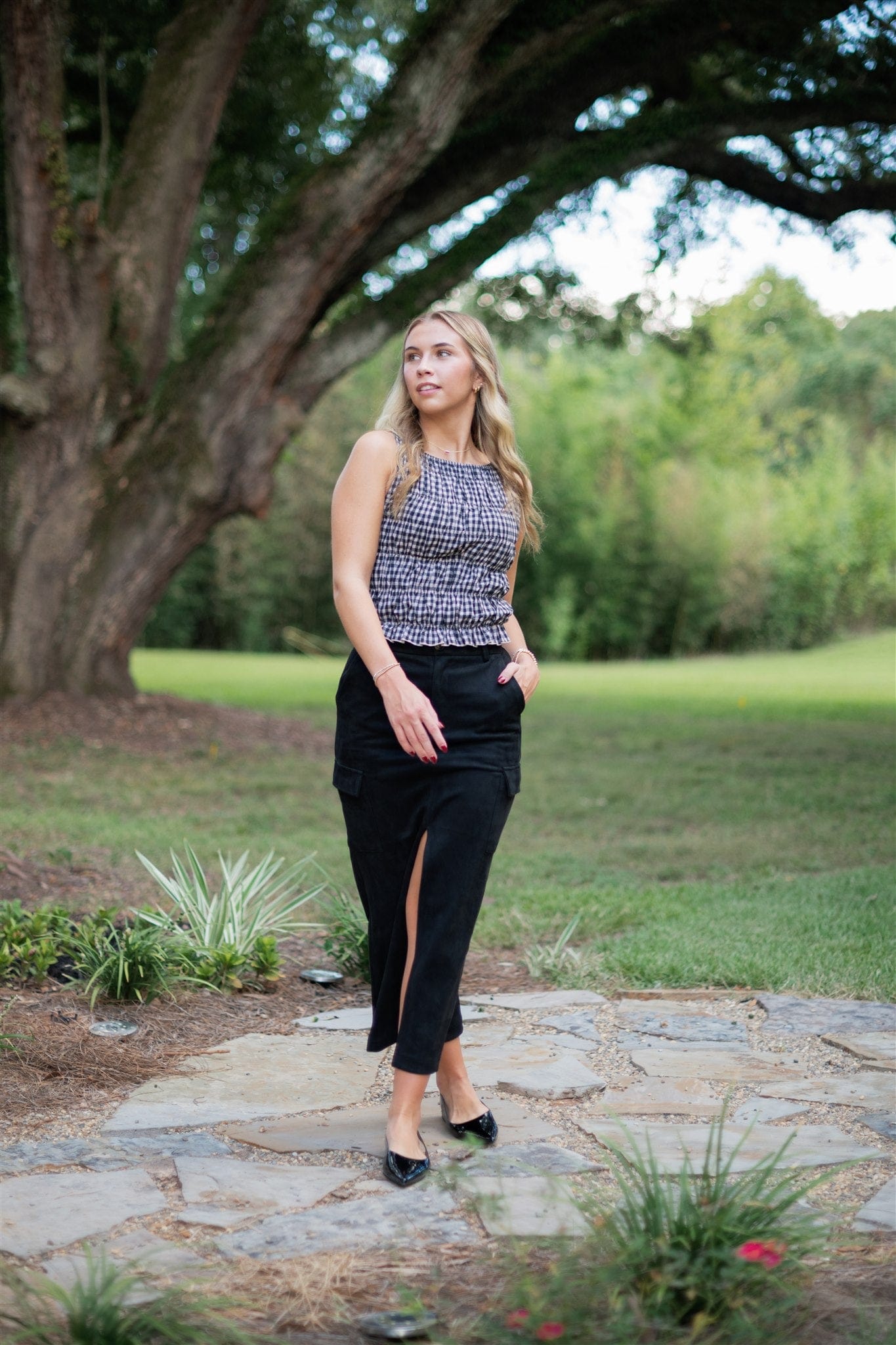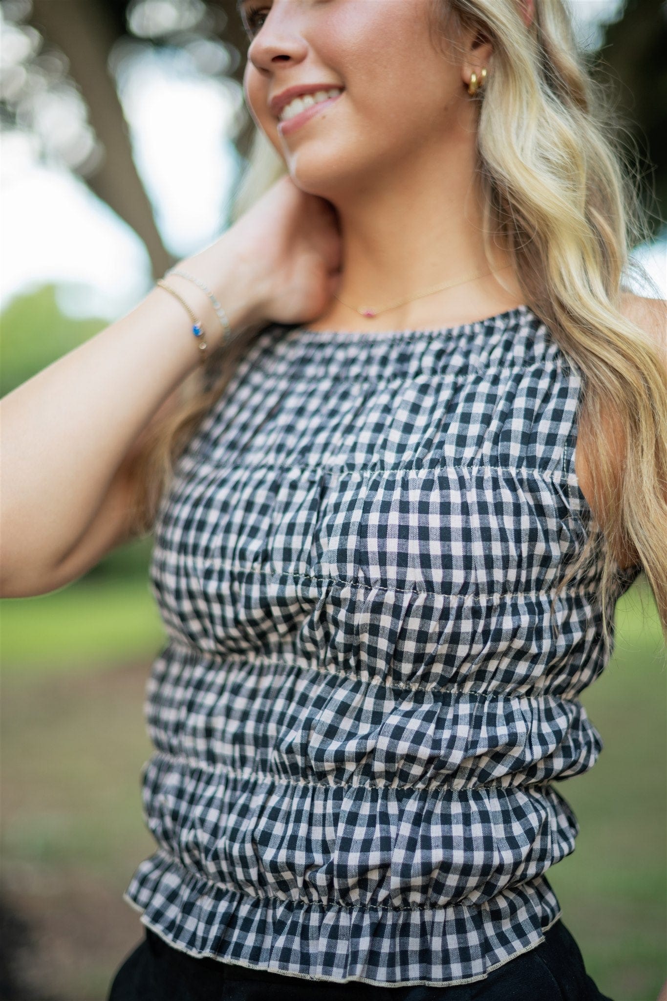 Embrace the cozy charm of fall with this Brown Gingham Smocked Top. Its stretchy, smocked fabric ensures a comfortable, flattering fit, while the sleeveless design and rounded neckline offer effortless style. Perfect for layering during seasonal transitions, this top brings warmth and versatility to your wardrobe with a timeless gingham pattern.