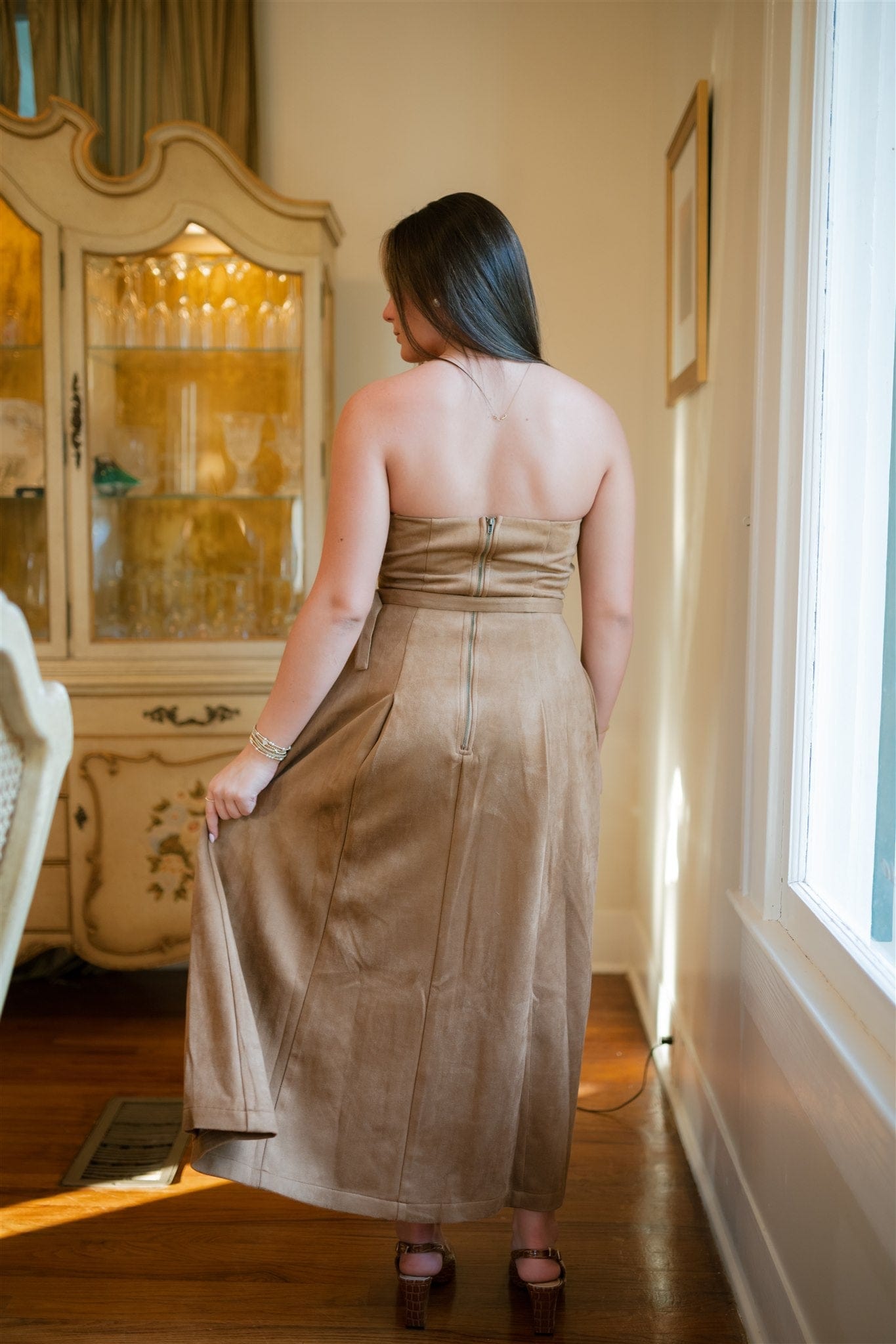 Embrace effortless fall elegance with this Camel Suede Belted Midi Dress. Crafted from soft faux suede, its strapless design highlights your neckline while the belted waist accentuates your silhouette. Featuring flowy fabric and convenient pockets on both sides, this midi dress combines style and practicality for the season’s cooler days. Perfect for transitional weather, it’s a versatile wardrobe staple that balances comfort and chic sophistication.