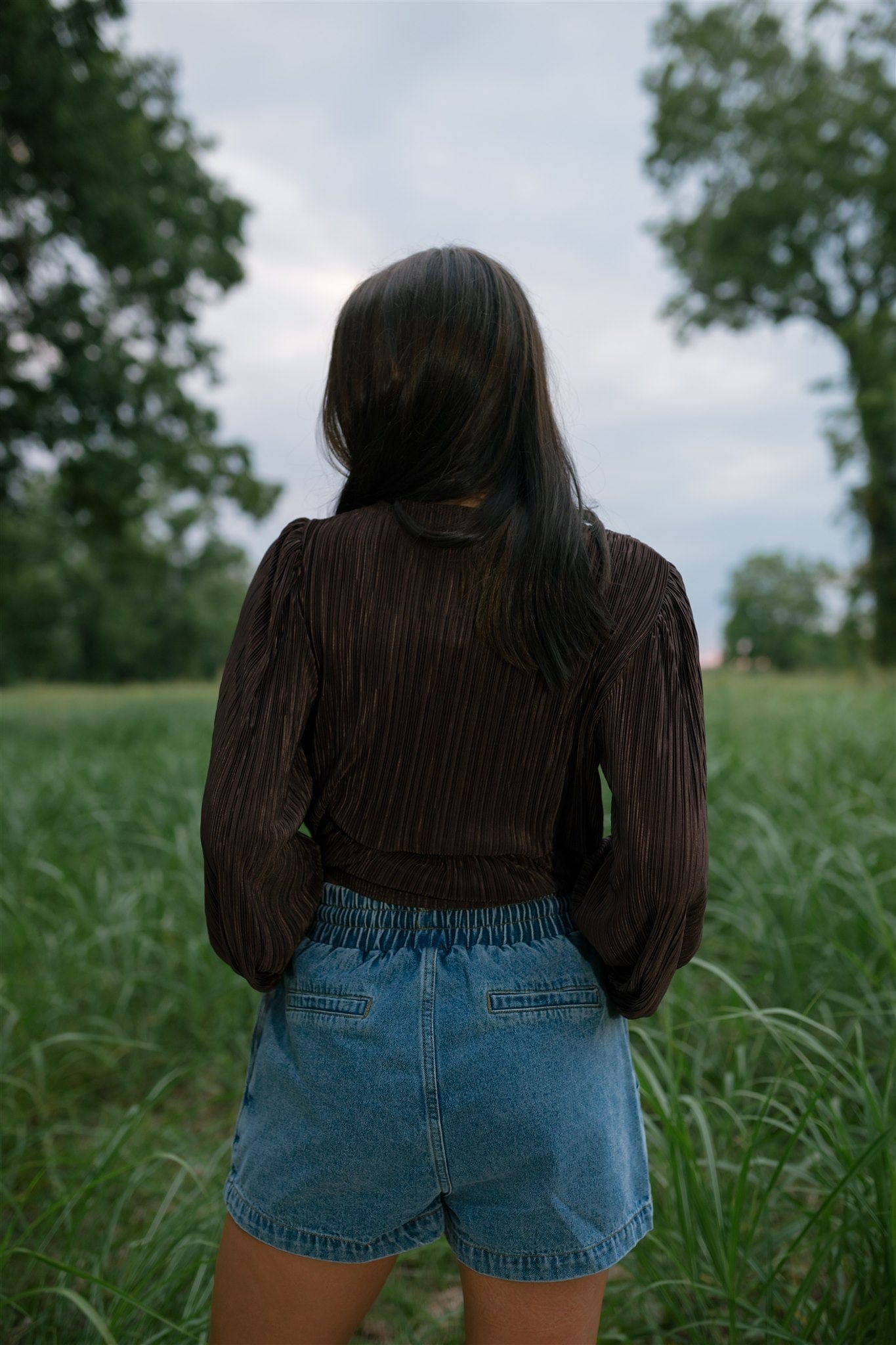 Elevate your fall wardrobe with this brown blouse featuring a charming tie-front detail and a flattering rounded neckline. Its long puff sleeves add a touch of romantic elegance, while the flowy fabric ensures all-day comfort and effortless style. Perfect for layering or wearing on its own, this blouse combines cozy sophistication with versatile appeal for any autumn occasion.