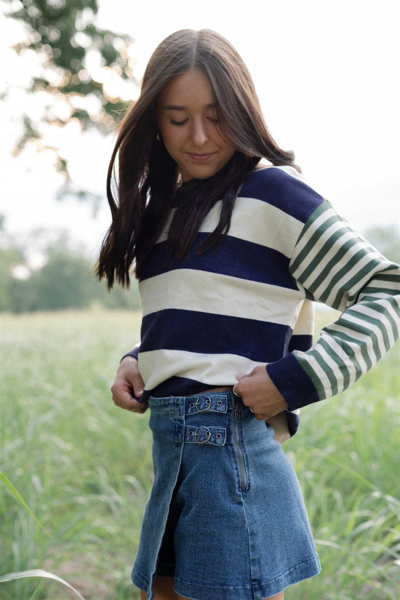 Elevate your Fall wardrobe with this Medium Wash Buckle Detail Skort. Featuring a flattering high-waisted fit and stylish double buckle accents, this denim skort combines the look of a skirt with the comfort of shorts. The side zip closure ensures a sleek silhouette, making it a versatile piece perfect for layering or wearing on its own. Embrace effortless style and comfort this season with this must-have Fall essential.