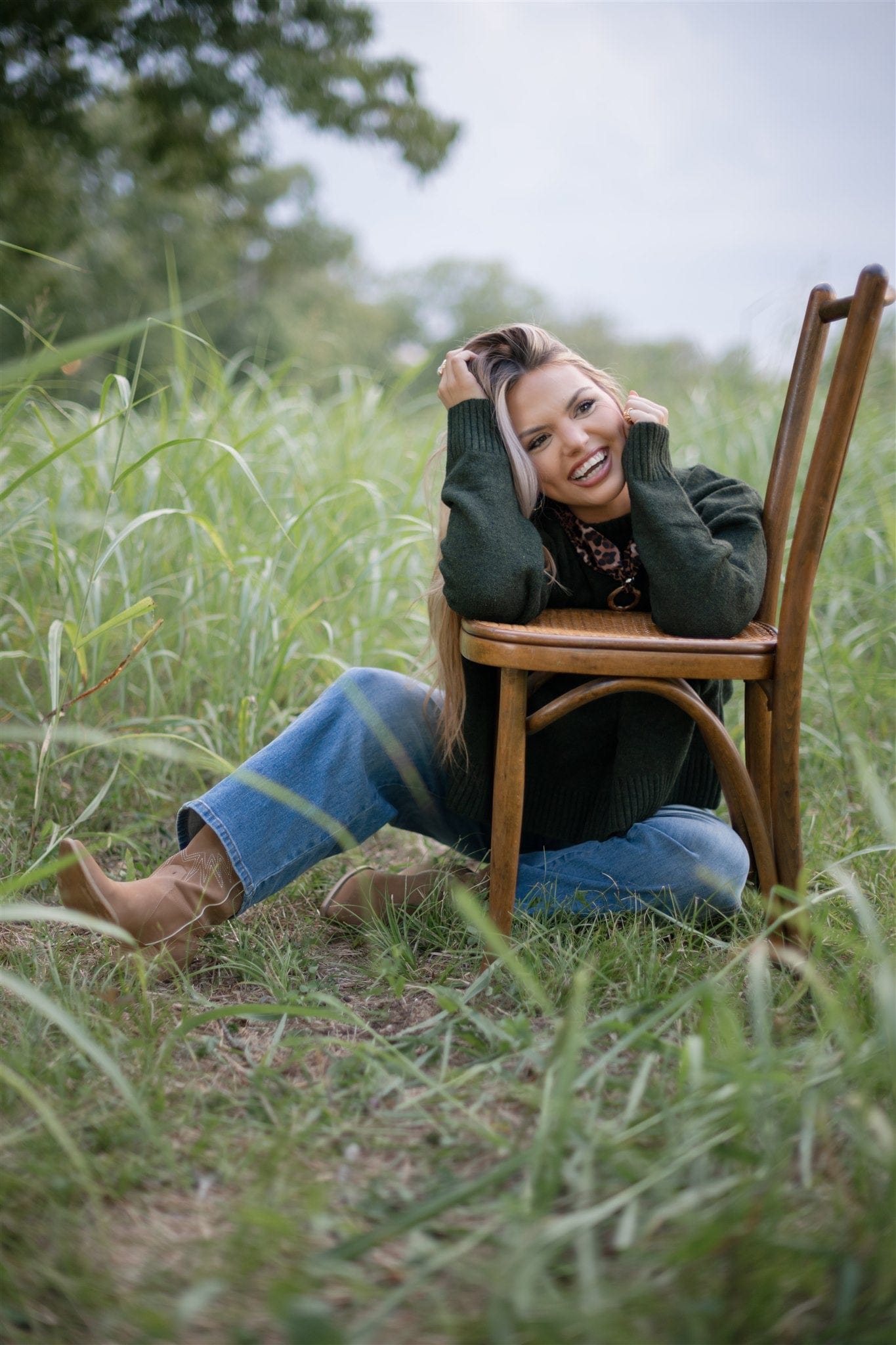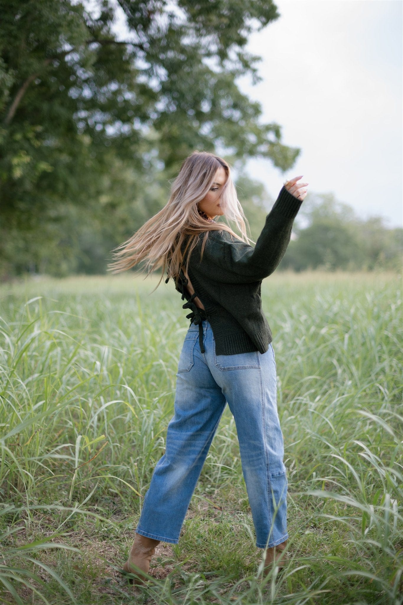 Embrace cozy elegance this Fall with our Olive Green Tie Back Sweater. Crafted from stretchy knit fabric, it offers a comfortable, flowy fit that moves with you. The rounded neckline adds timeless charm, while the stylish tie-back detail creates a flattering silhouette. Perfect for layering or wearing alone, this sweater blends softness and style effortlessly to keep you warm and fashion-forward as the seasons change.