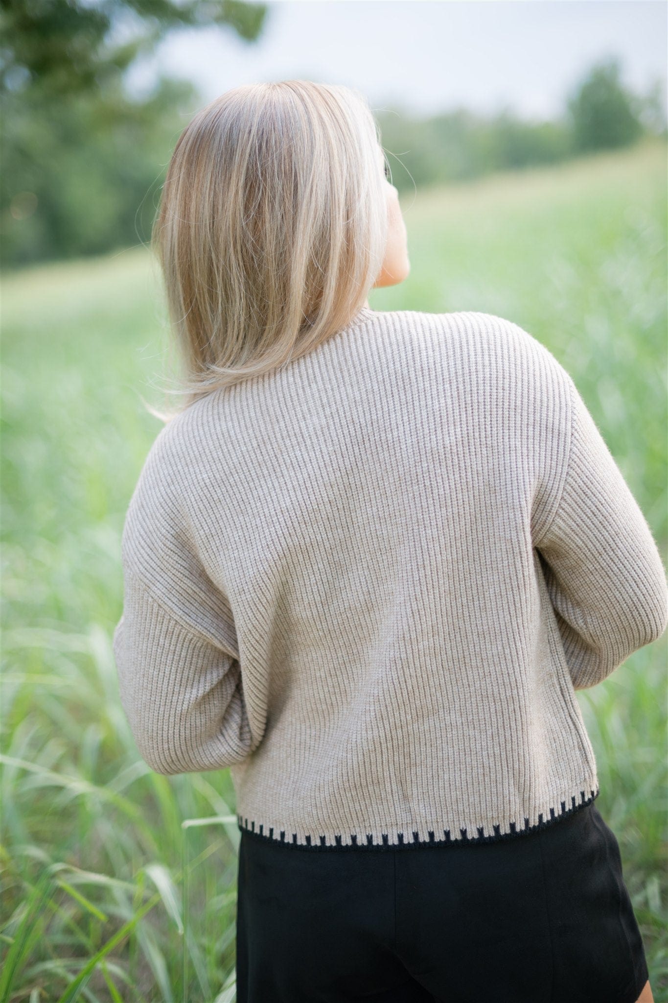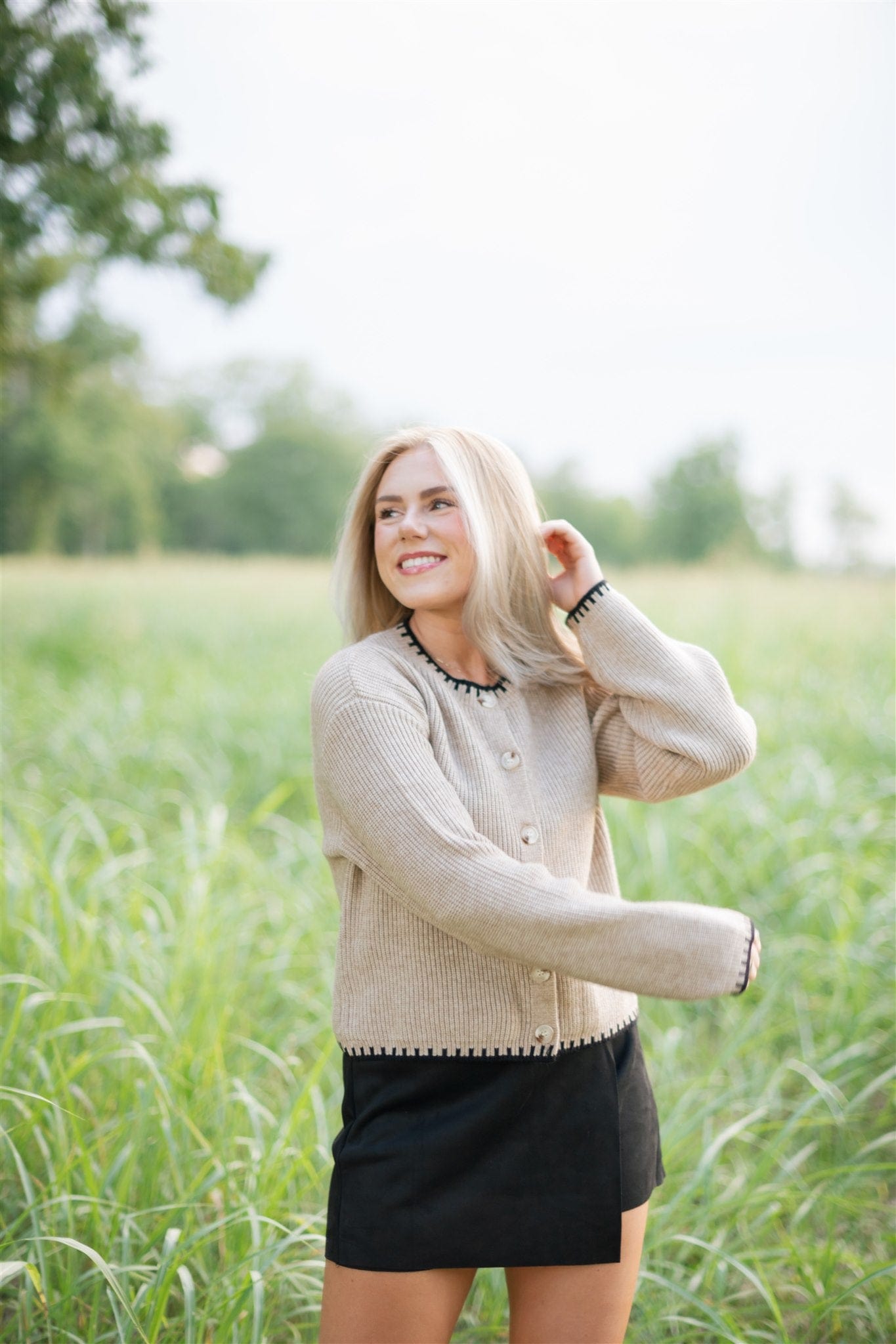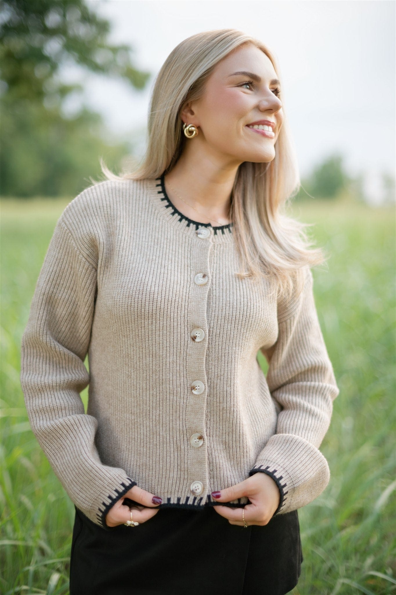Elevate your fall wardrobe with this taupe cardigan sweater featuring chic black trim details. Its button-up design and long bell sleeves create a flattering, flowy silhouette that's perfect for layering. Crafted from soft knit fabric, it offers cozy comfort while keeping you stylish during cooler days. This versatile piece seamlessly blends sophistication with ease, making it an essential addition to your seasonal collection.