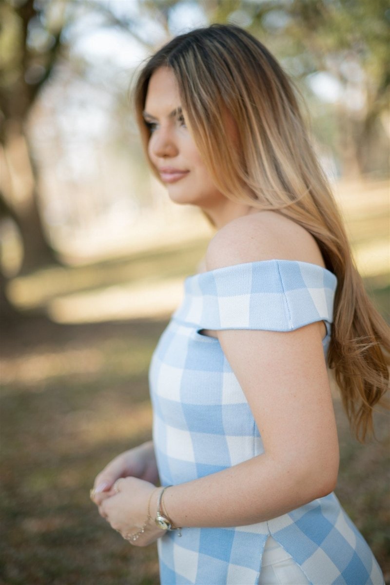 Effortless spring style meets comfort in this blue and white checkered knit top. The off-shoulder silhouette creates a flattering, modern look perfect for casual outings or layered styling. Crafted from stretchy knit fabric, it moves with you throughout your day while maintaining its shape. The classic checkered pattern pairs seamlessly with your existing wardrobe, making it an essential seasonal piece that transitions from day to night with ease.