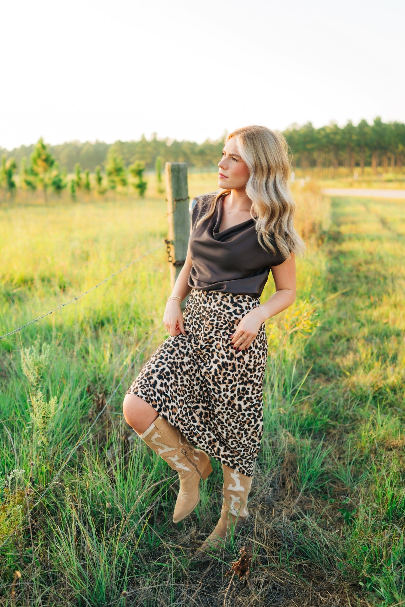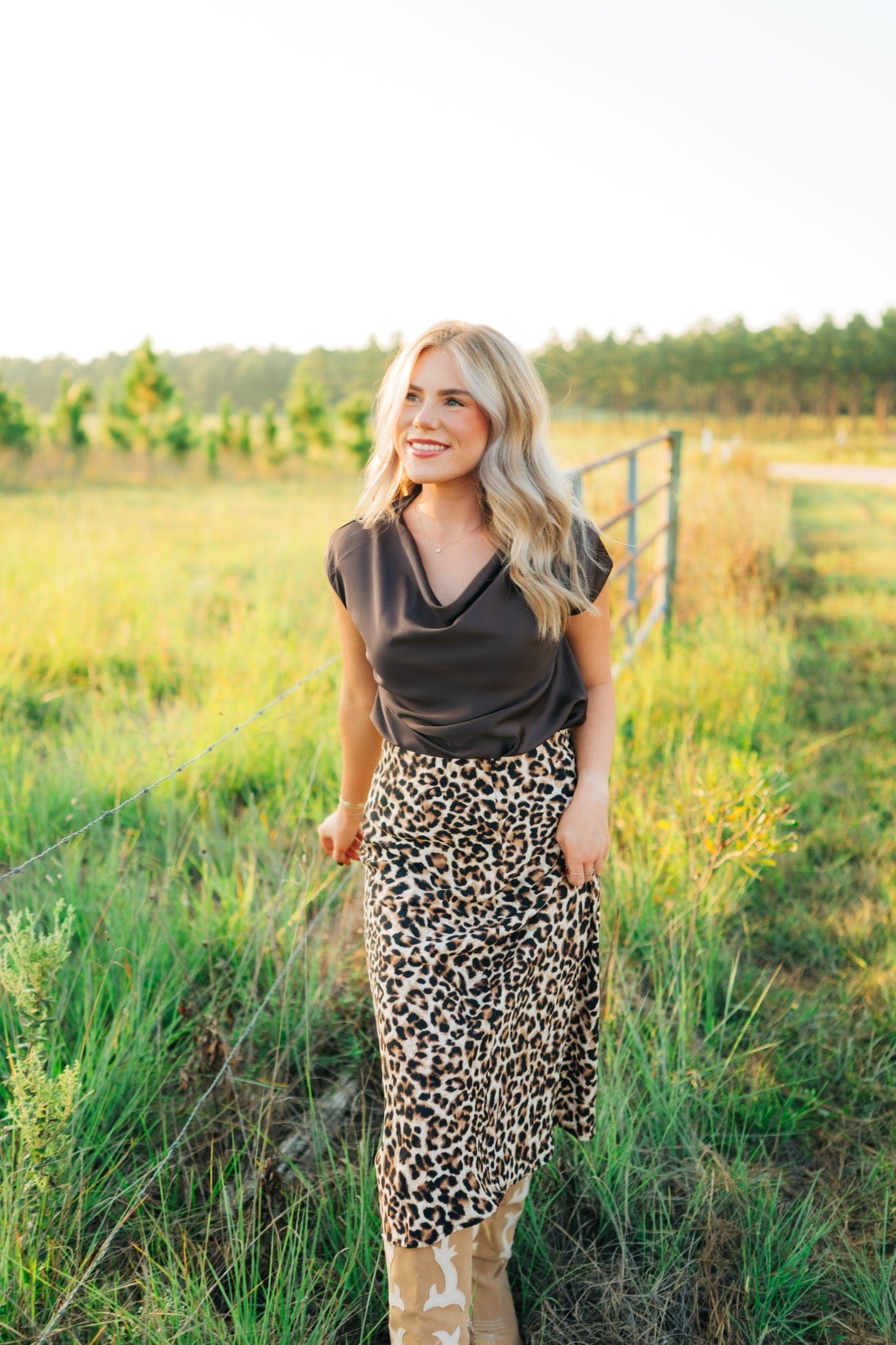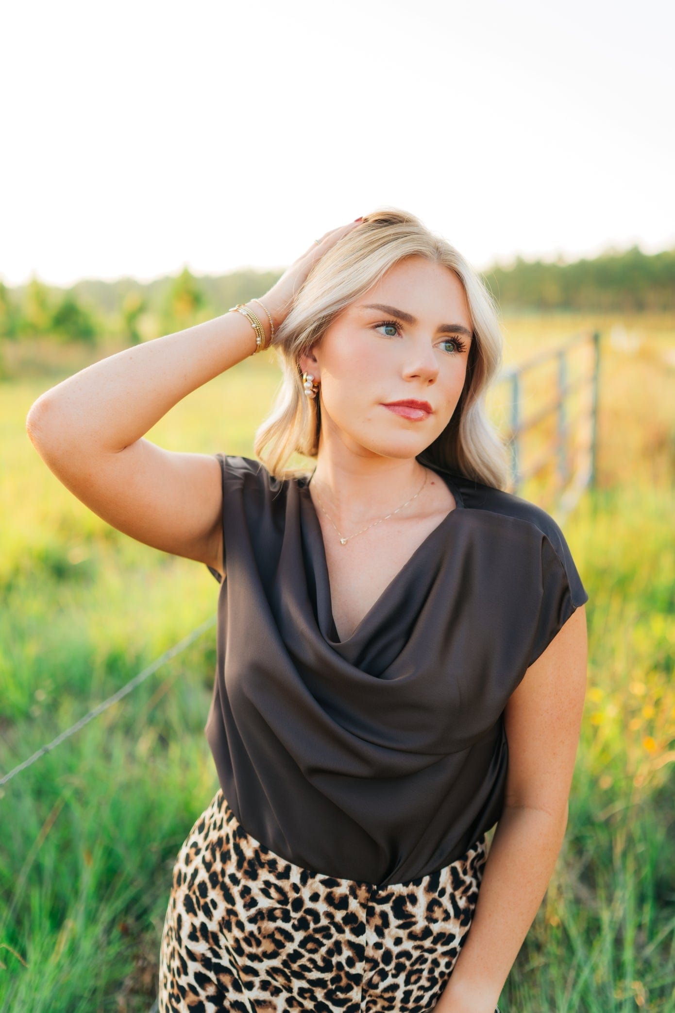 Embrace the season with the Brown Cowl Neck Satin Top, designed for effortless sophistication. Its luxurious satin fabric flows beautifully, complemented by a chic cowl neckline and flattering cap sleeves. This versatile piece adds a warm, elegant touch to your fall wardrobe, perfect for both casual days and special occasions.