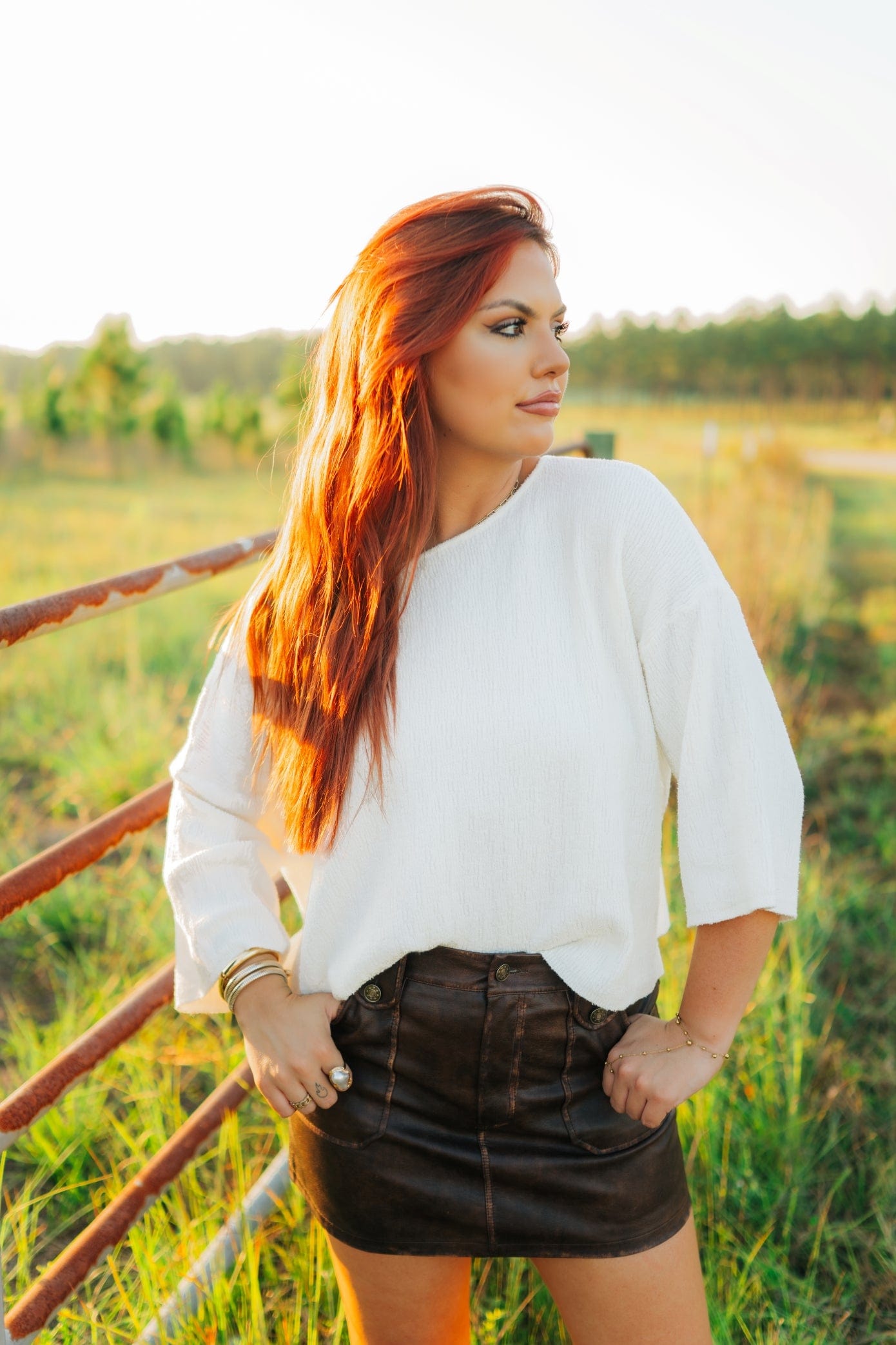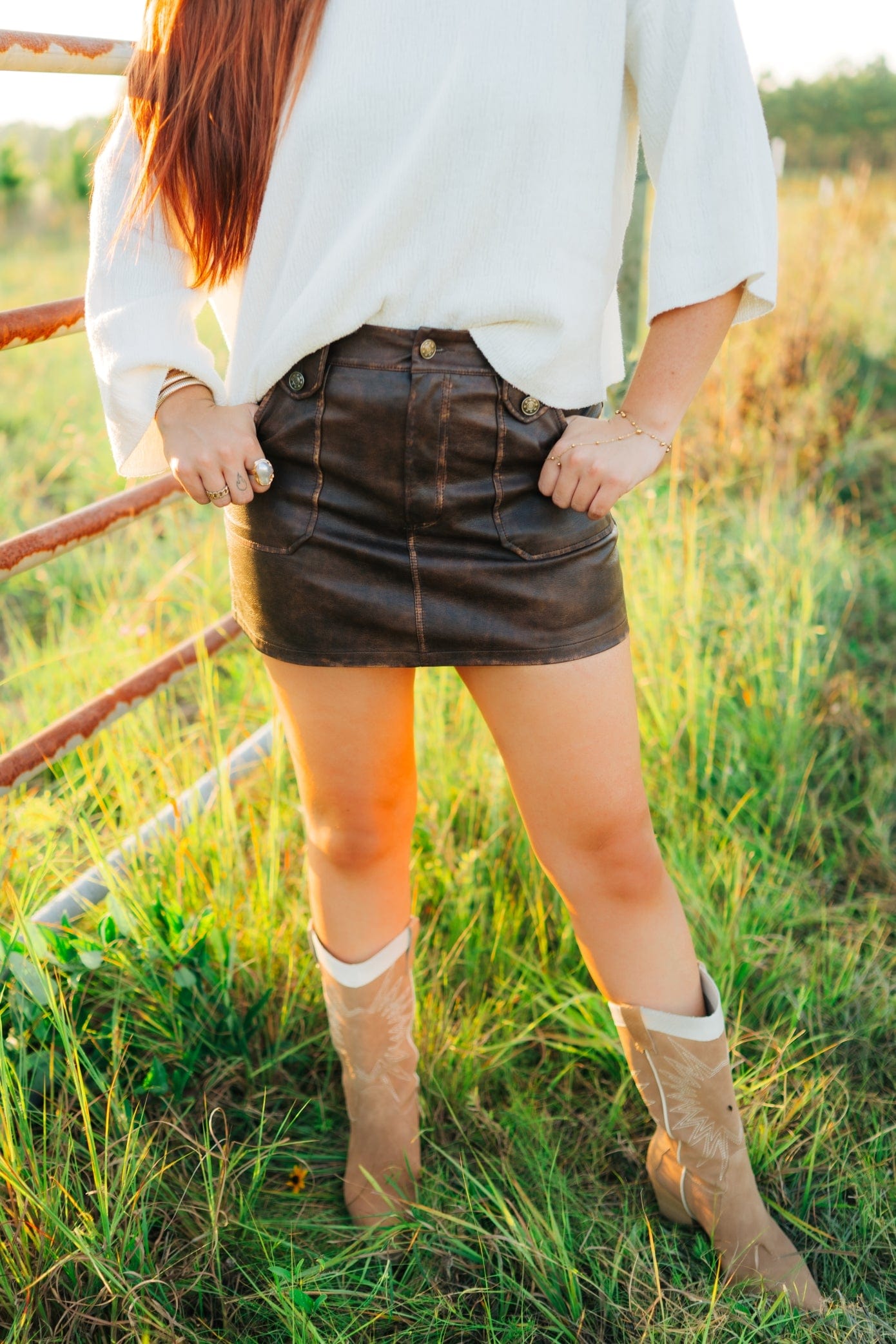 Elevate your fall wardrobe with this brown rustic leather mini skirt. Featuring a high-waisted, fitted design, it beautifully flatters your silhouette while adding a timeless edge to any outfit. Perfect as a seasonal staple, its rich texture and warm tone make it ideal for layering with your favorite sweaters and boots. Embrace comfort and style effortlessly this season.