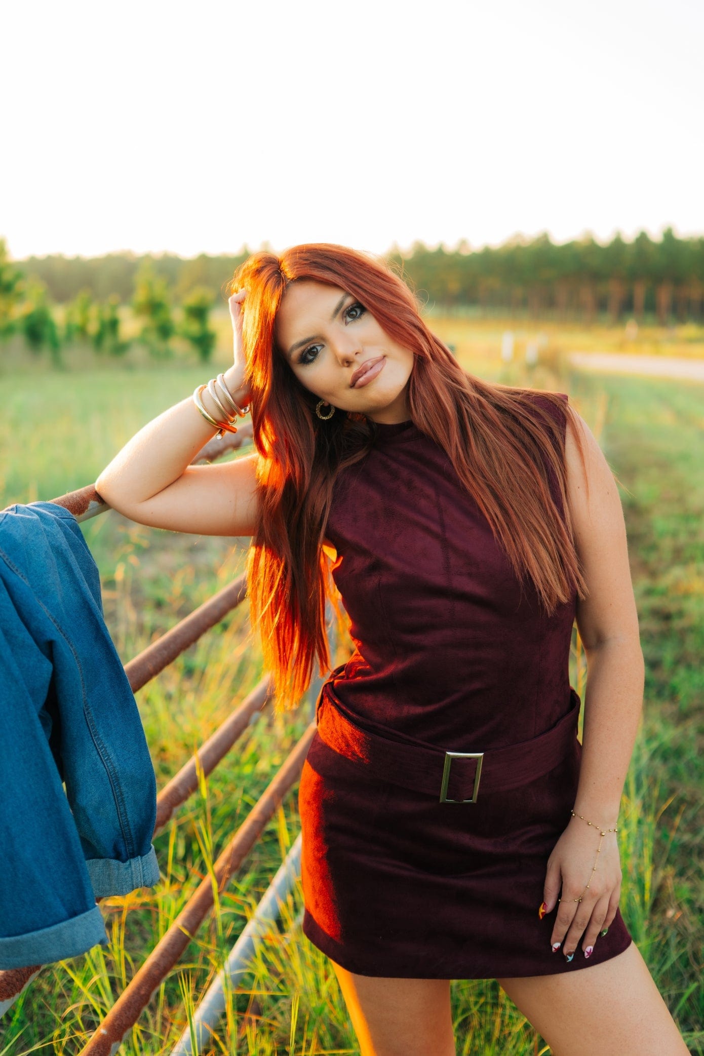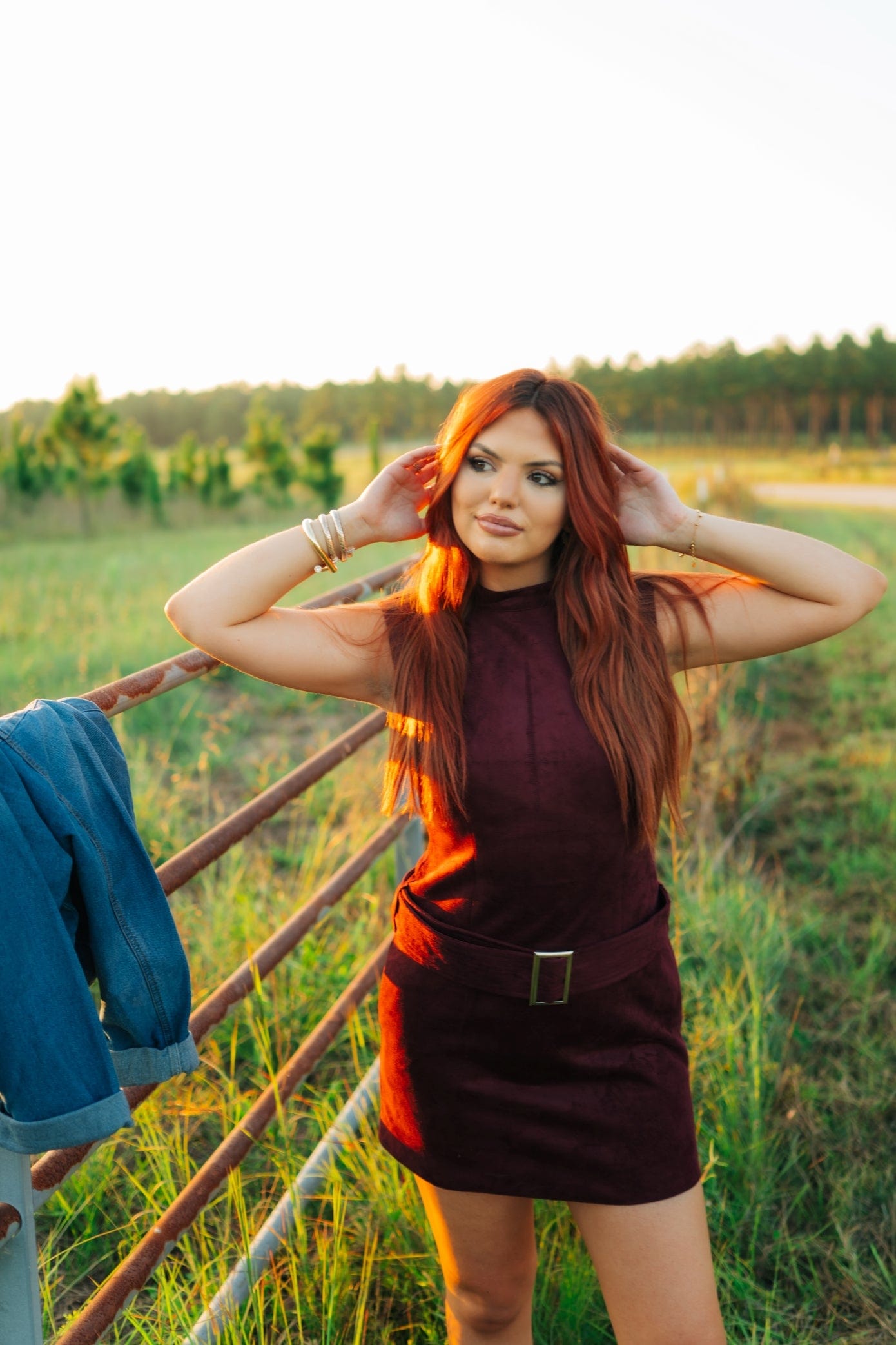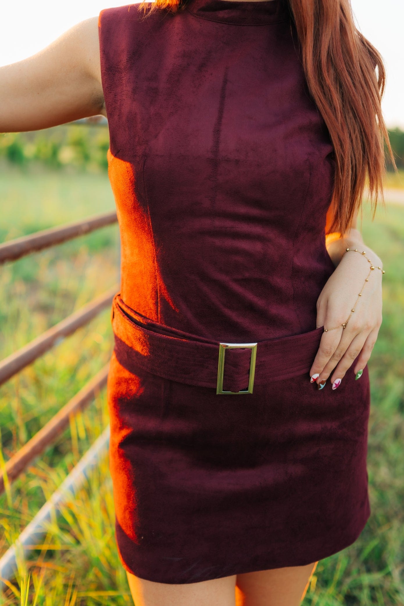 Crafted in rich burgundy suede, this mini dress features a sophisticated mock neckline and delicate cap sleeves for an elegant fall look. The belted waist defines your figure, while the fit-and-flare silhouette creates a flattering shape that moves gracefully. Ideal for autumn occasions, this dress perfectly balances style and comfort to elevate your seasonal wardrobe.