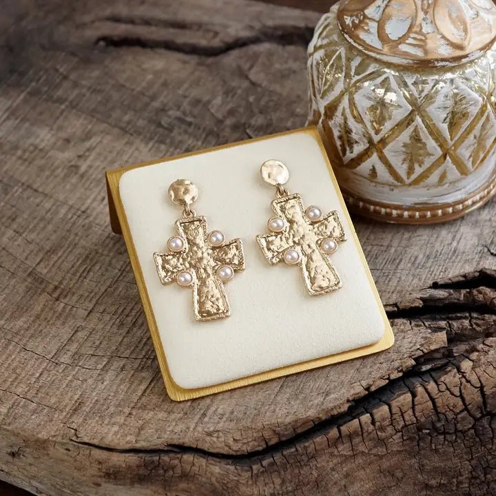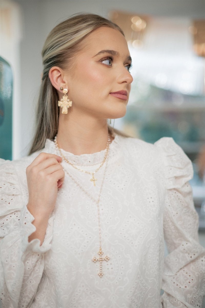 Make a bold faith-forward statement with these striking gold cross drop earrings, elevated by lustrous pearl accents. The delicate pearl details catch light beautifully, adding sophistication and dimension to the classic cross silhouette. Perfect for layering with your everyday look or standing alone as a meaningful accessory. These versatile drops work equally well for Sunday service or weekend style, offering that premium touch that transforms any outfit into something special.
