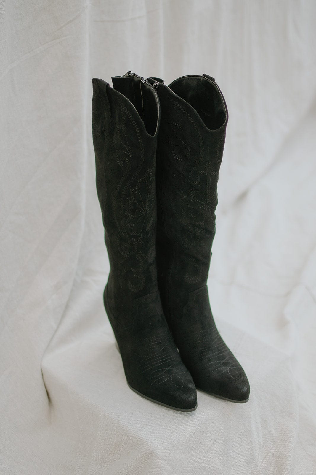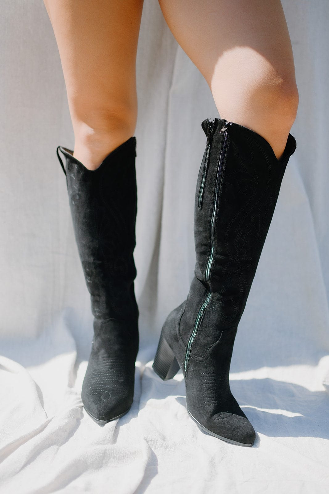 Hit the dance floor in style with these black suede cowgirl boots from Pierre Dumas! Crafted from faux suede for a rich texture, they feature a 3" stacked wood heel and double zipper for a comfortable fit. With a 15" shaft, these boots are the perfect western style choice for any concert or night out. They run a bit large and we have these in pale pink and green too!
