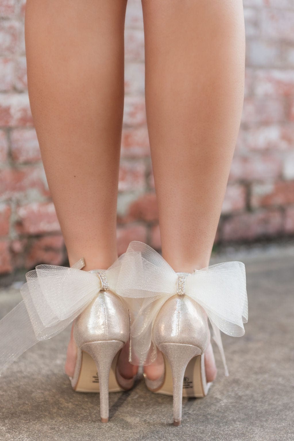 Elevate your style with our Gold Shimmer Glitz Bow Back Heels! The metallic gold and shimmer detailing will add a touch of glamour to any outfit. The square toe and rhinestone bow back give a unique and elegant look. Perfect for any special occasion, these heels will make you stand out and feel confident.