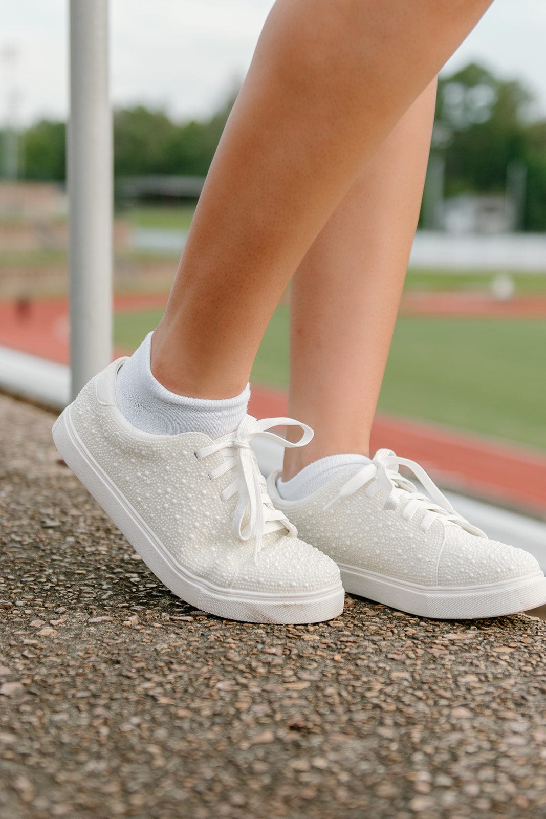 Elevate your outfit with our White Pearl Sneakers! These lace-up sneakers feature beaded pearls for a touch of sophistication. Not only stylish, they're also comfortable for all-day wear. Pair these versatile sneakers with so many different looks!