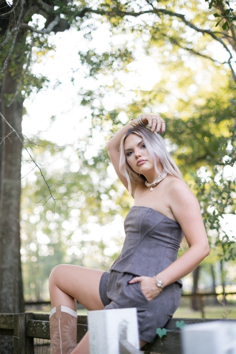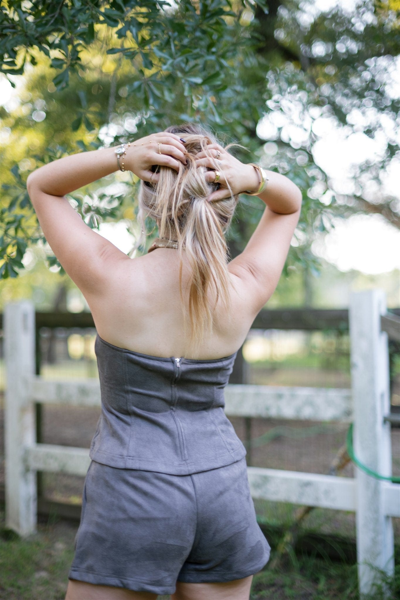 Elevate your fall wardrobe with this ash brown suede short set, featuring a strapless peplum top and high-waisted shorts crafted from soft faux suede. Perfect for transitioning into cooler weather, this set combines stylish comfort with a flattering silhouette that highlights your waist. Ideal for day-to-night wear, it offers a chic, versatile look that stands out effortlessly.