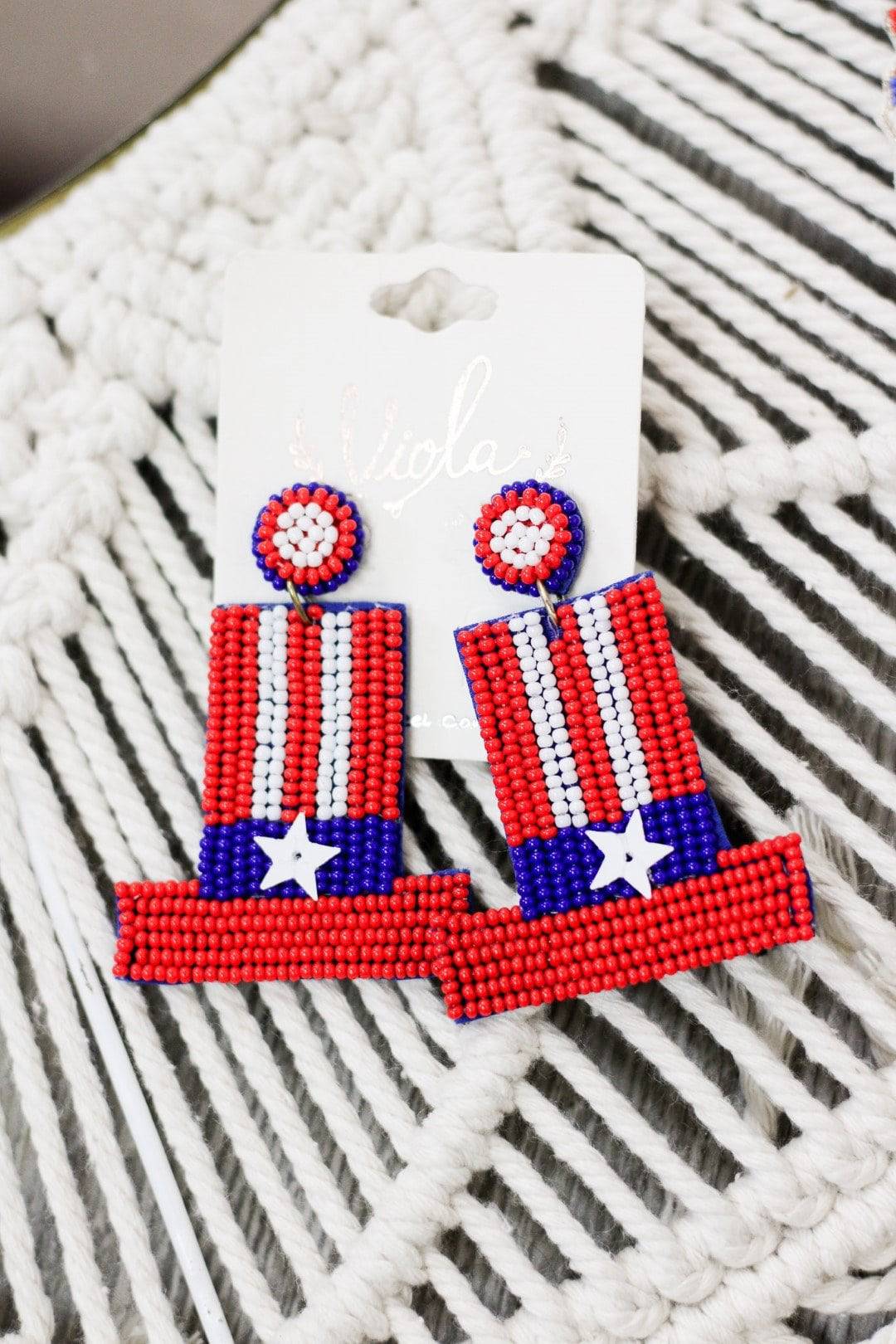 Rep your patriotic spirit with these beaded Uncle Sam tophat earrings! With a red, white, and blue beaded earring in a tophat shape, this fun accessory is perfect for the summer or any patriotic holiday or event!