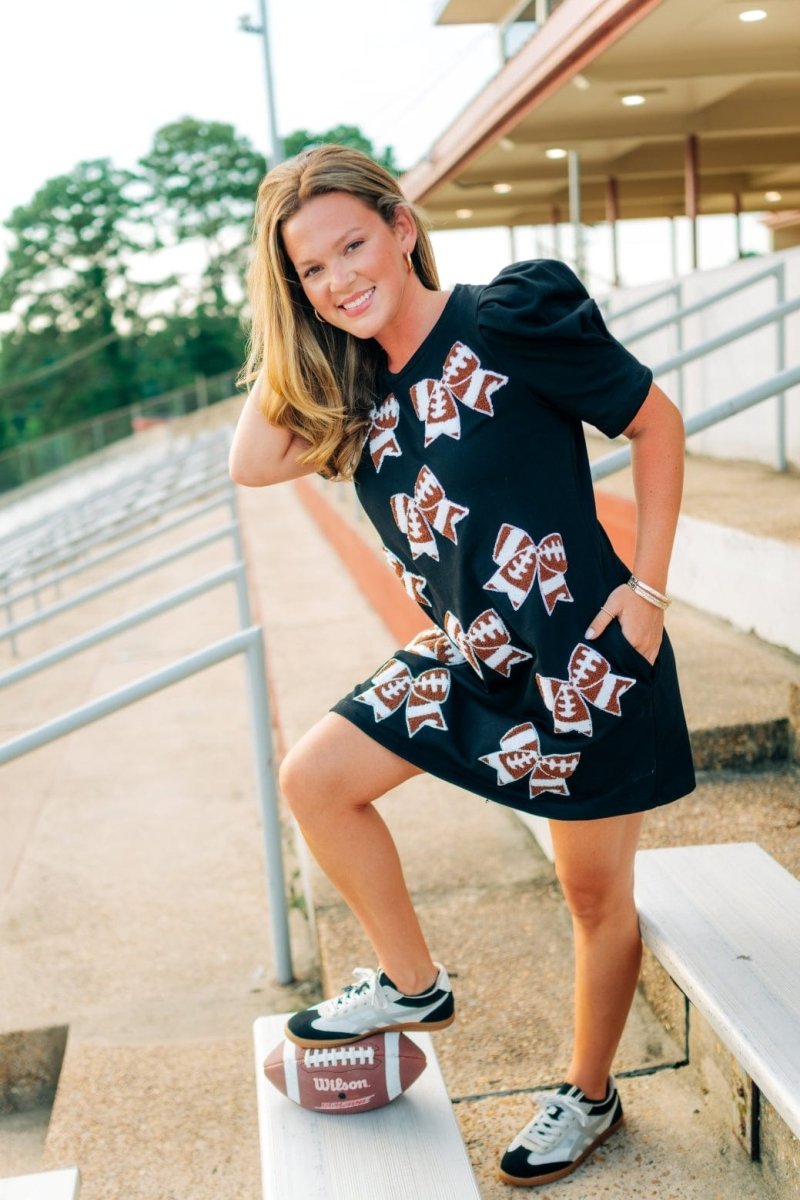 Get ready to score a fashion touchdown with our Black Football Bow Patch Mini Dress! The stretchy and comfortable shirt dress features a rounded neckline and short puff sleeves, perfect for game day. And don't miss the adorable football bow details that add a playful touch. Show off your team spirit with this must-have dress!