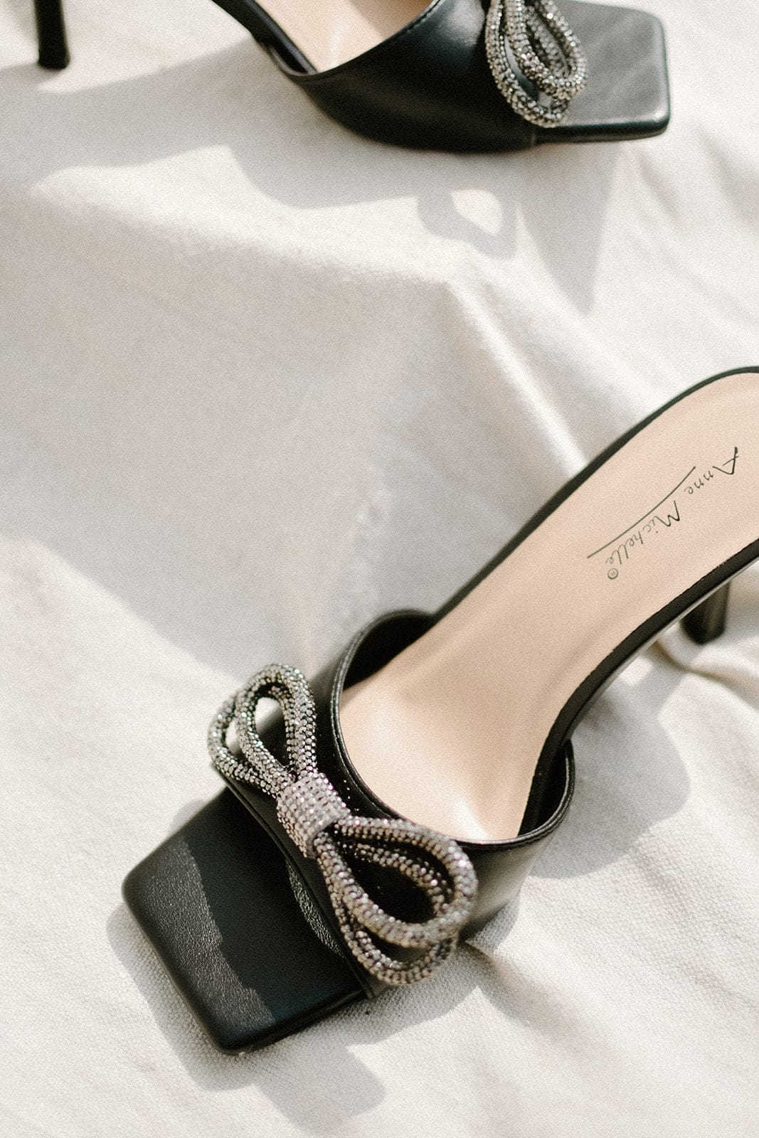 • a double rhinestone bow for flash and a square toe with a 3" stiletto heel for the latest trendy look