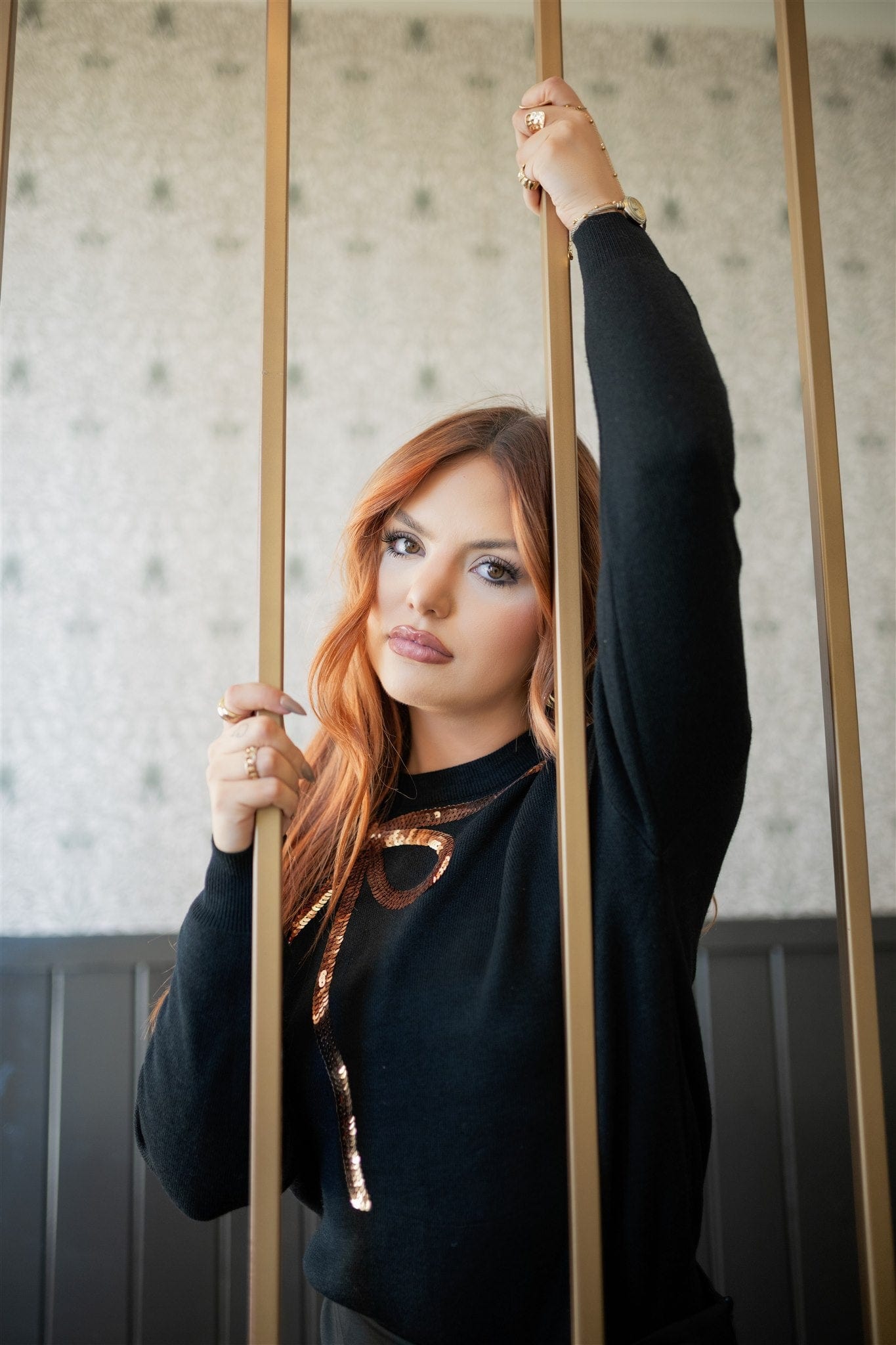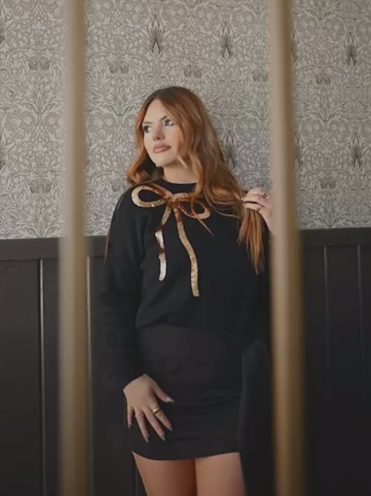 Celebrate the season in style with this Black Sequin Bow Holiday Sweater. Featuring a flattering rounded neckline and long sleeves, this stretchy knit sweater offers both comfort and festive charm. The shimmering gold sequin bow adds a touch of holiday sparkle, making it perfect for Christmas gatherings or cozy winter nights. Embrace warmth and elegance effortlessly with this must-have seasonal piece.