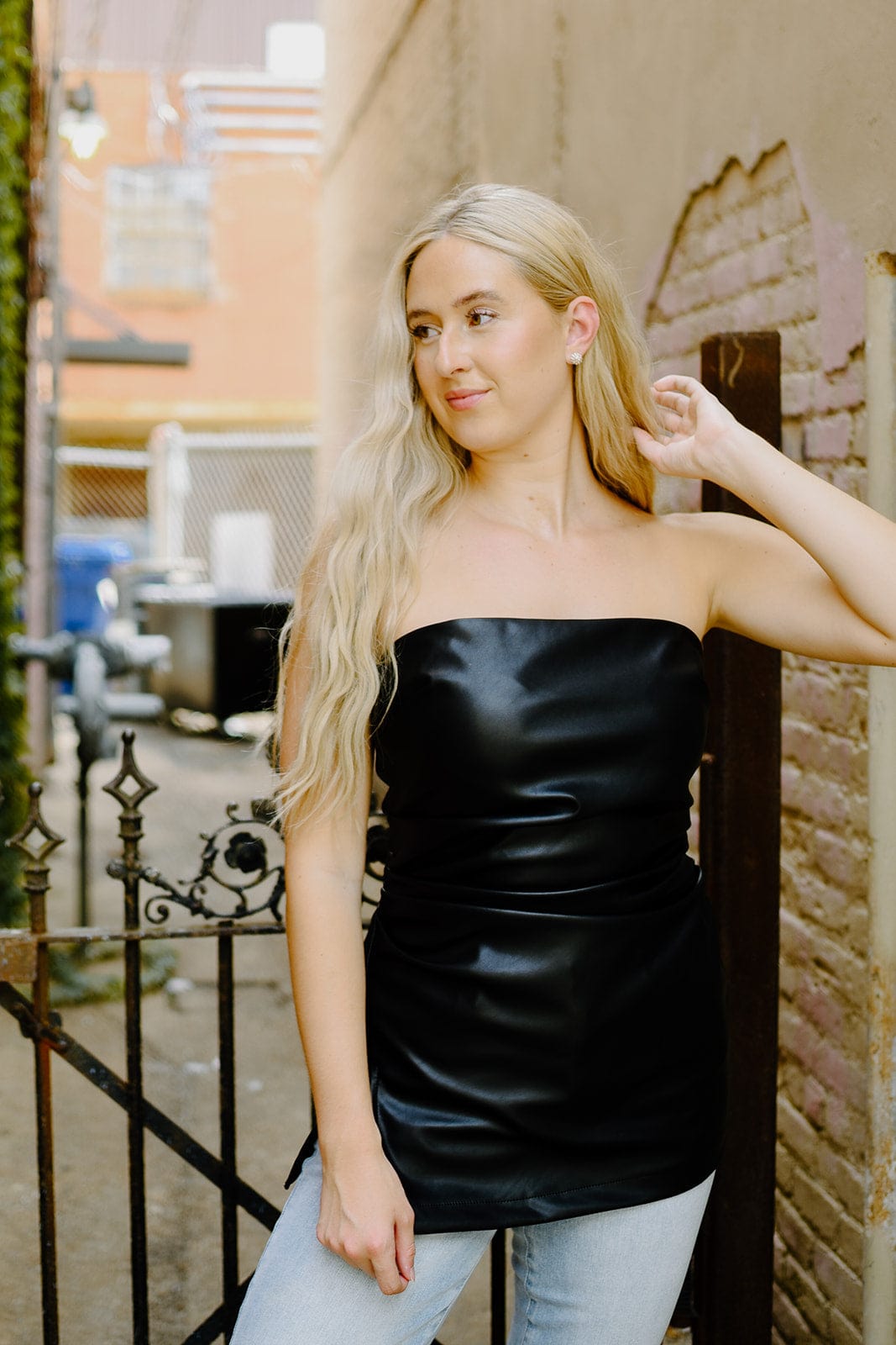 The Black Vegan Leather Tube Top is a sleek and edgy fashion piece that combines the classic tube top style with the contemporary appeal of vegan leather. The tube top is solid black, giving it a bold and sophisticated appearance. The top is strapless and designed in a tube top style, which means it lacks sleeves and straps. A Black Vegan Leather Tube Top is a versatile fashion piece that can be styled in various ways. It's suitable for both casual and more formal occasions, depending on how you choose to accessorize and pair it with other clothing items.