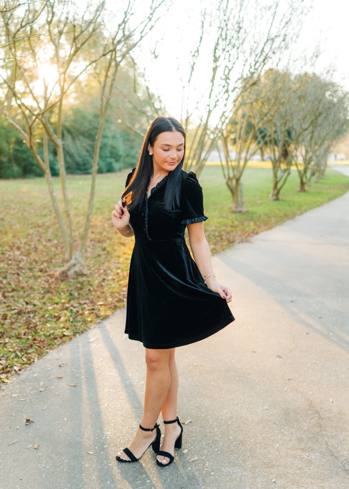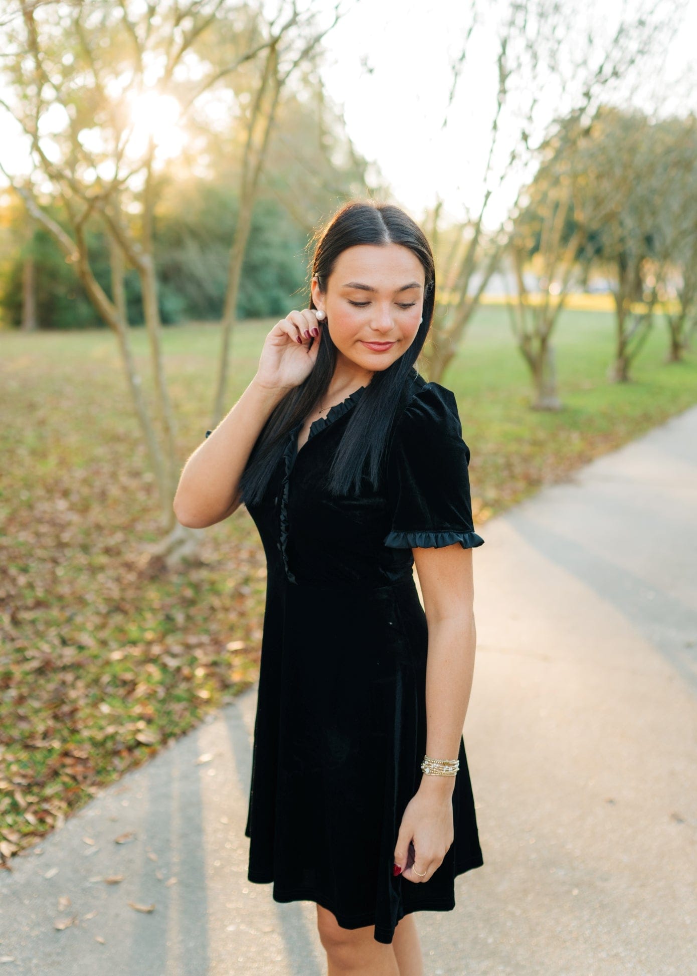 Elevate your holiday wardrobe with this sophisticated black velvet mini dress. Crafted from luxuriously soft velvet with a gentle stretch, it moves with you while maintaining its elegant drape. The flattering V-neckline and button-front closure create a refined silhouette, while the playful ruffle hem adds movement and dimension. Short sleeves keep it seasonally versatile, and the flowy cut ensures all-day comfort. Perfect for festive gatherings, date nights, or whenever you want to feel effortlessly chic and put-together.