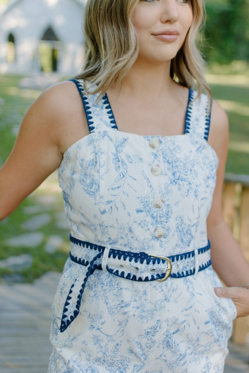 Experience style and comfort like never before with our Blue Floral Belted Denim Jumpsuit! This sleeveless jumpsuit features a flattering square neckline and a beautiful blue floral print. The stretchy material ensures a perfect fit while the belted waist and flare leg add a touch of elegance. Upgrade your wardrobe today!