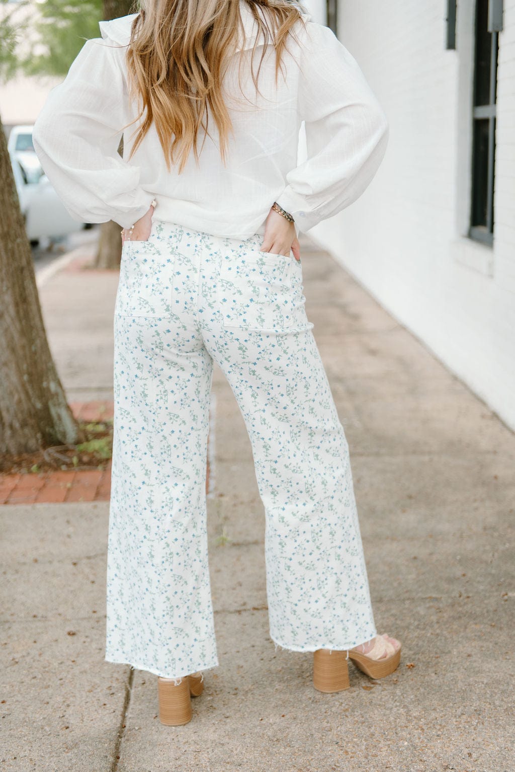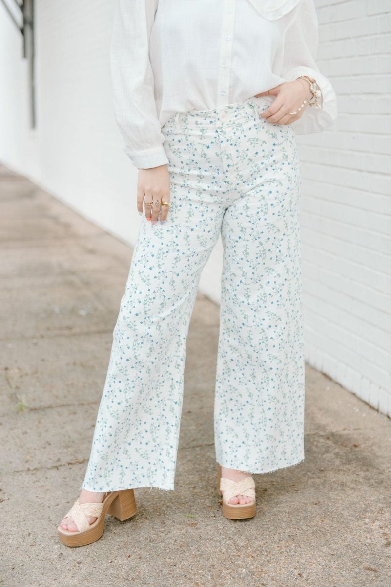 Elevate your Spring wardrobe with our Blue Floral Wide Leg Jeans. Made from soft white denim, these high waisted jeans feature a beautiful blue floral print, adding a trendy touch to any outfit. The raw cut hem and stretchy fabric provide a comfortable fit, while the wide straight leg style flatters every body type.