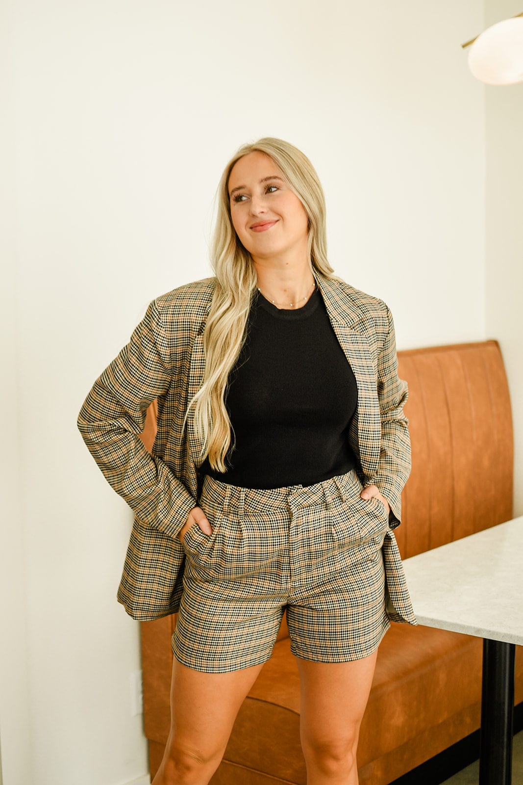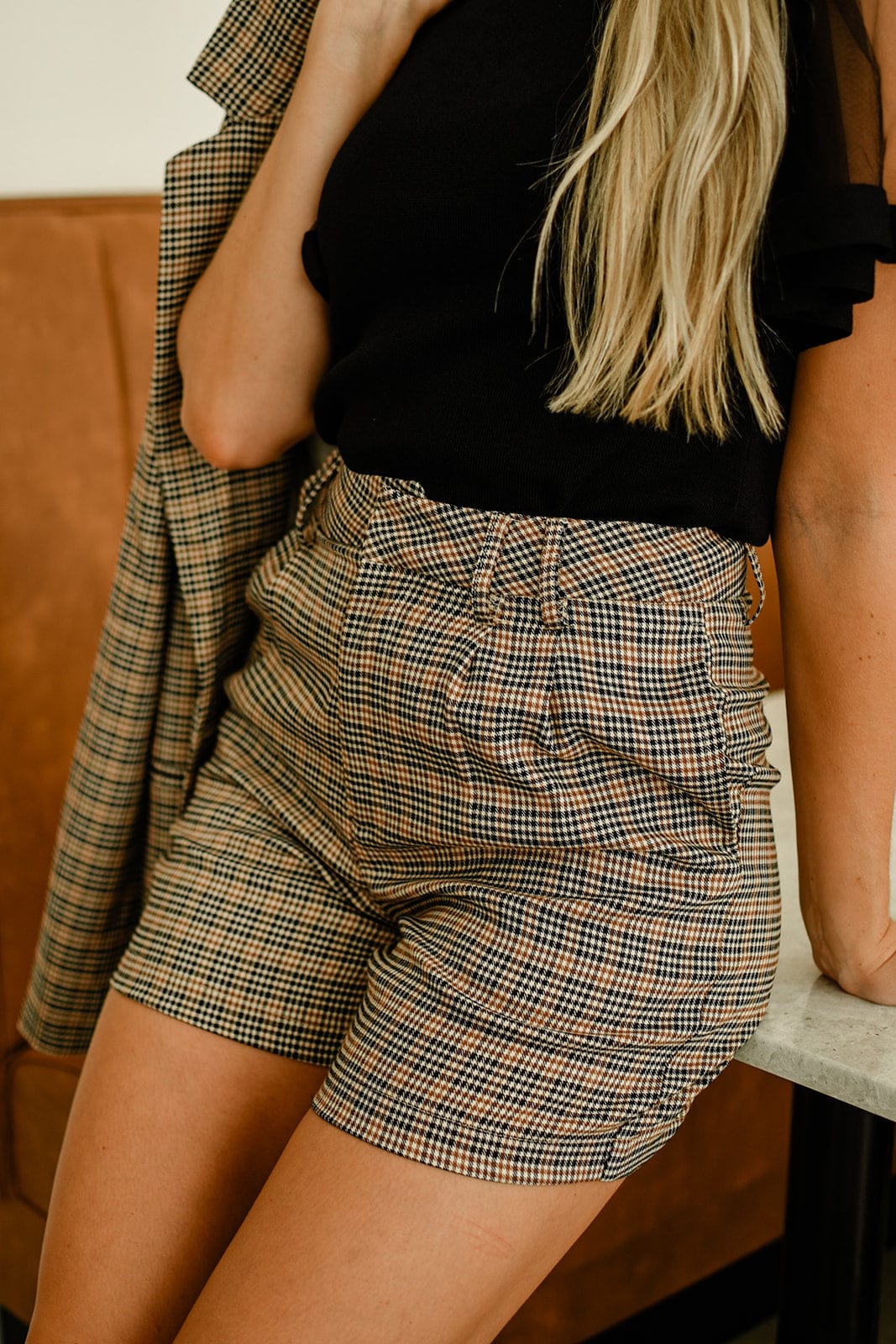 The Brown Plaid Set High Waisted Shorts are a stylish and versatile fashion piece that combines a cream, black and brown pattern with a contemporary design. These shorts feature a high-waisted design that elongates the legs and provides a flattering silhouette.