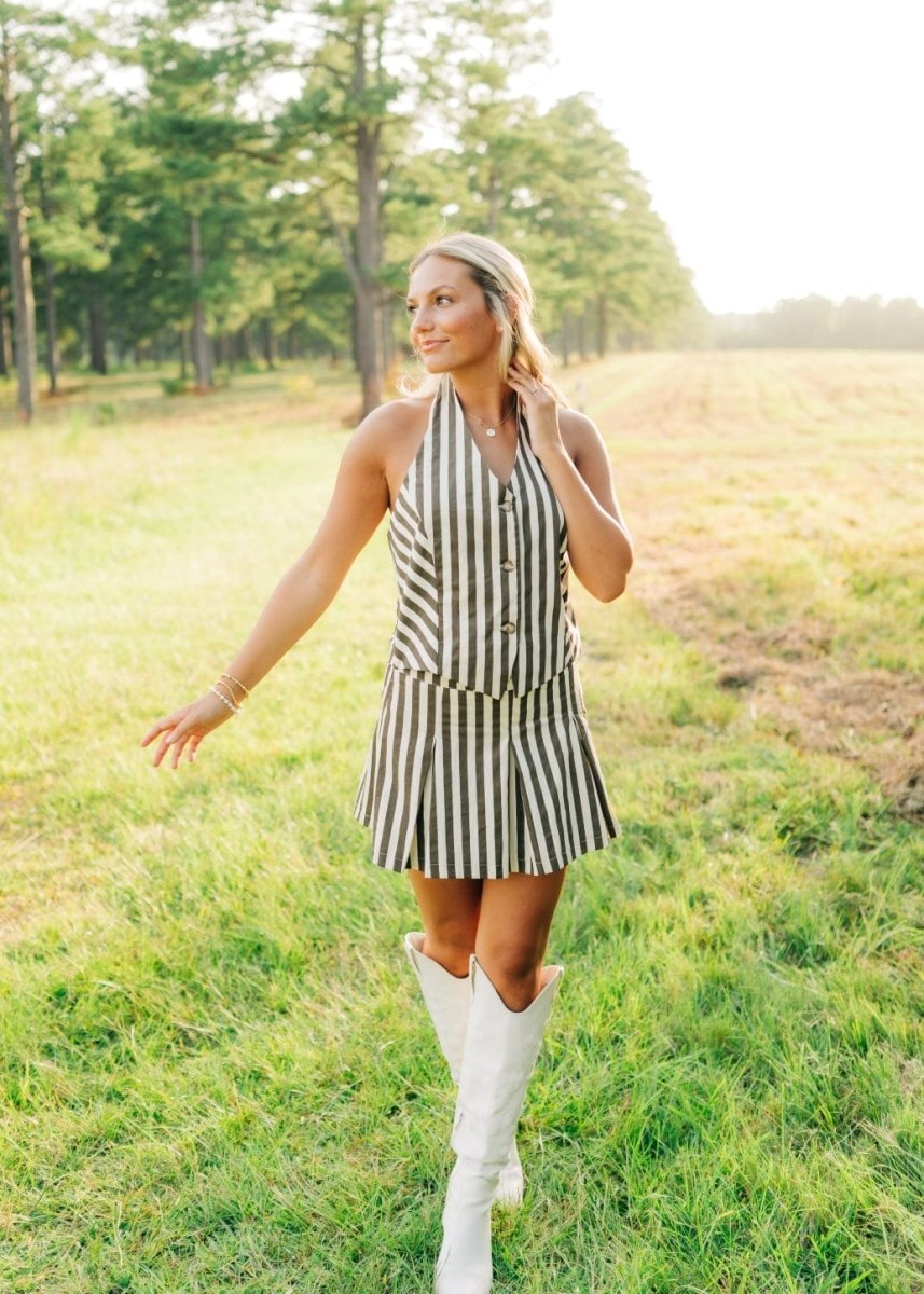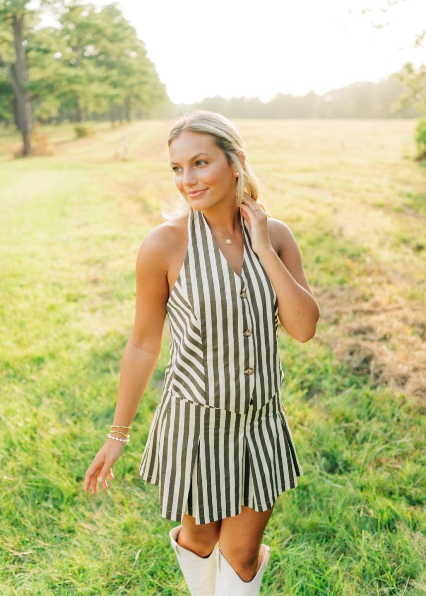 Elevate your summer style with our Brown Striped Pleated Vest Mini Dress! The halter neck and v-neckline create a flattering silhouette, while the button front and pleated design add a touch of sophistication. Perfect for any occasion, this mini dress will keep you looking chic and comfortable.