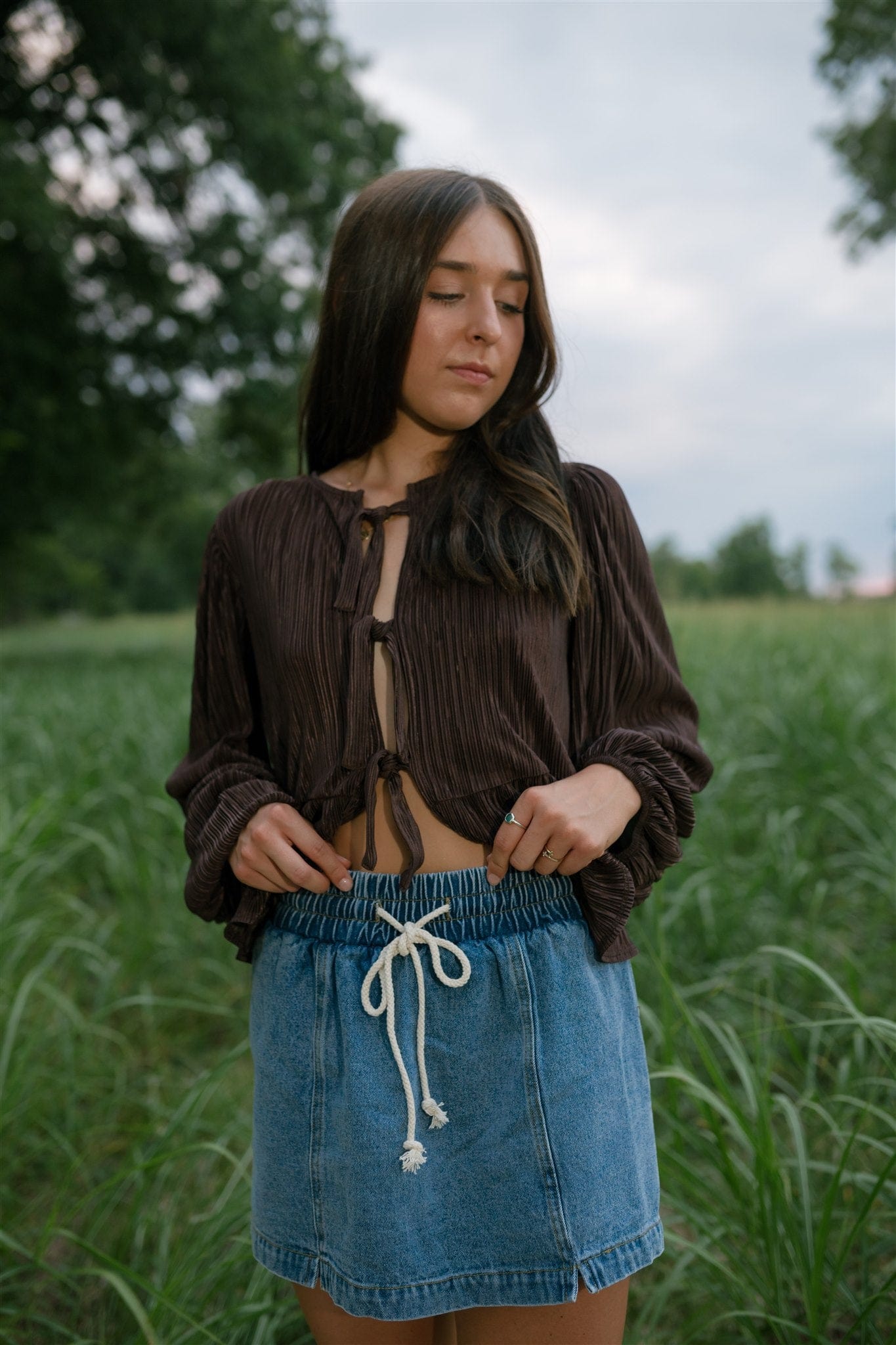 Elevate your fall wardrobe with this brown blouse featuring a charming tie-front detail and a flattering rounded neckline. Its long puff sleeves add a touch of romantic elegance, while the flowy fabric ensures all-day comfort and effortless style. Perfect for layering or wearing on its own, this blouse combines cozy sophistication with versatile appeal for any autumn occasion.