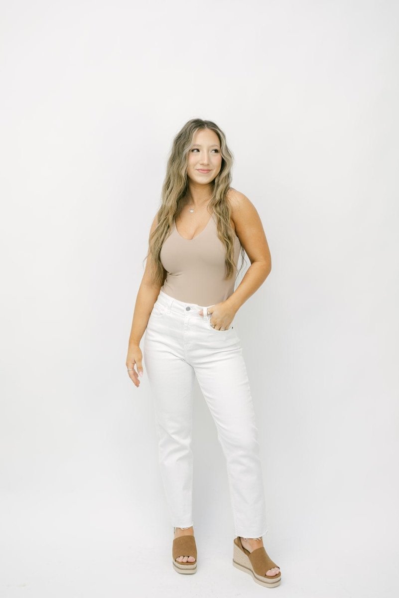 Comfort stretchy denim is that perfect middle ground for a vintage look but has enough stretch to last all day. A pair of straight leg, frayed hem white jeans styled with dainty heeled sandals is the perfect look.