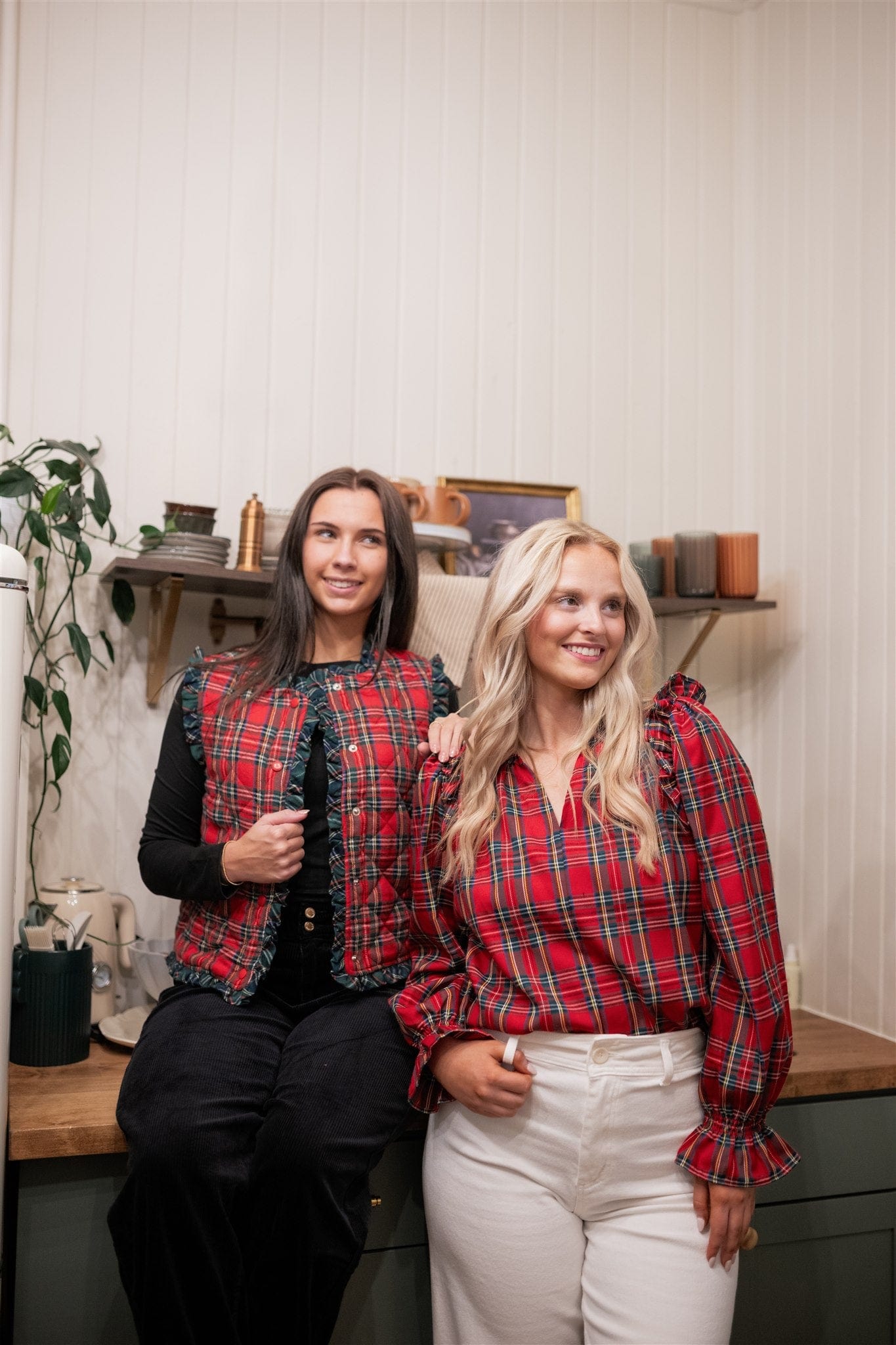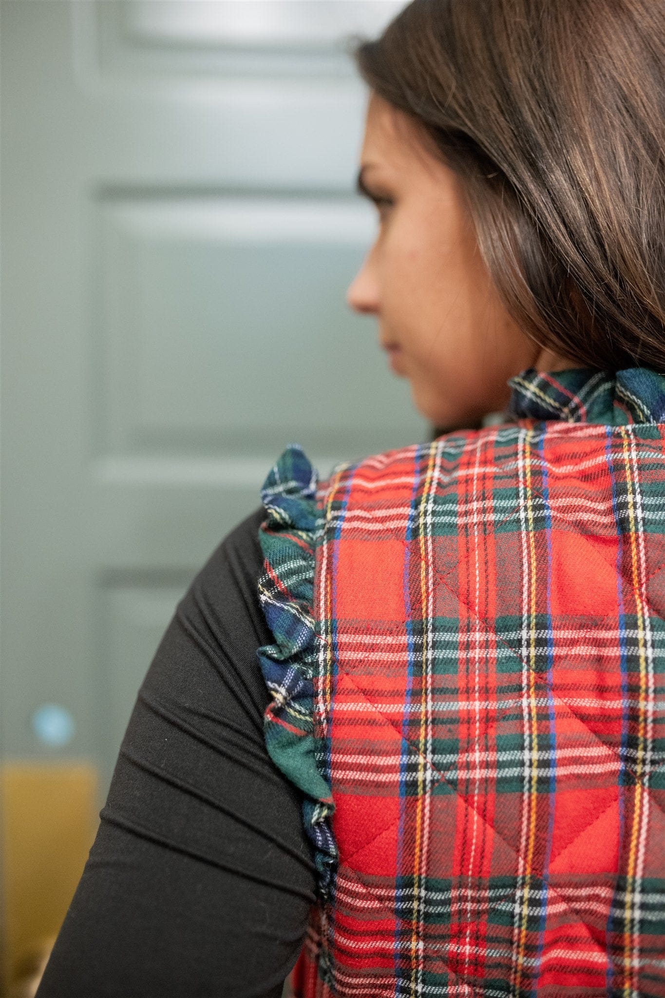 Stay festive and cozy this holiday season with our Christmas Plaid Quilted Vest. Featuring a classic red and green plaid pattern, sleeveless design, and charming ruffle hem detail, this button-up vest adds a stylish layer to any outfit. The quilted fabric provides warmth without bulk, making it perfect for chilly days. Elevate your holiday wardrobe with a piece that combines comfort and seasonal cheer effortlessly.