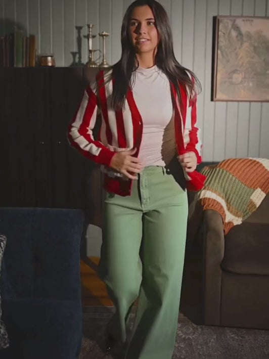 Celebrate the holiday season in cozy style with this Christmas Striped Cardigan. Featuring red and cream stripes, long sleeves, and a button-up front, it offers warmth and classic charm. The nostalgic Christmas truck embroidery on the pockets adds festive flair, making it perfect for spreading holiday cheer at gatherings or cozy nights in. This knit cardigan blends comfort with seasonal spirit effortlessly.
