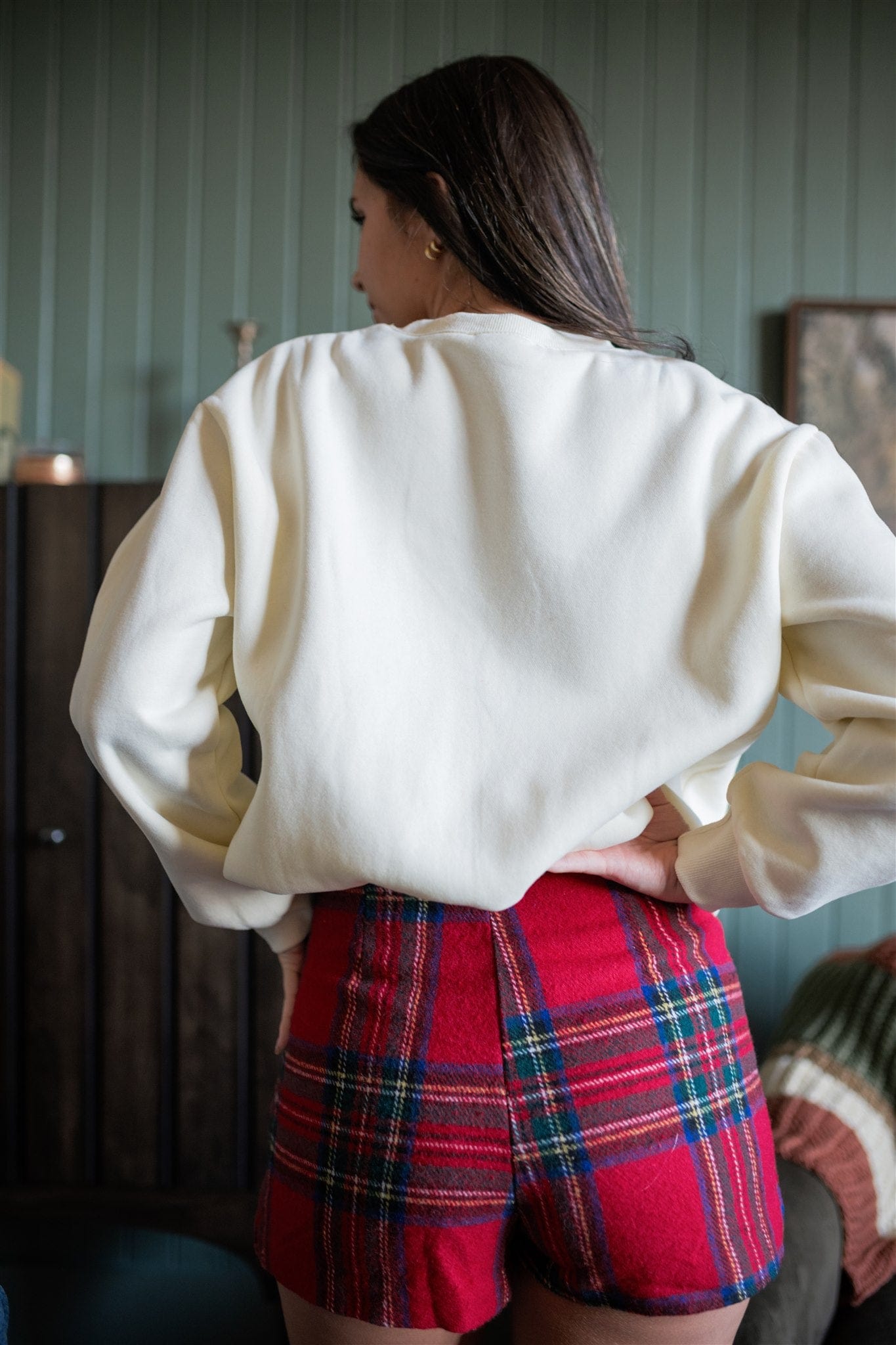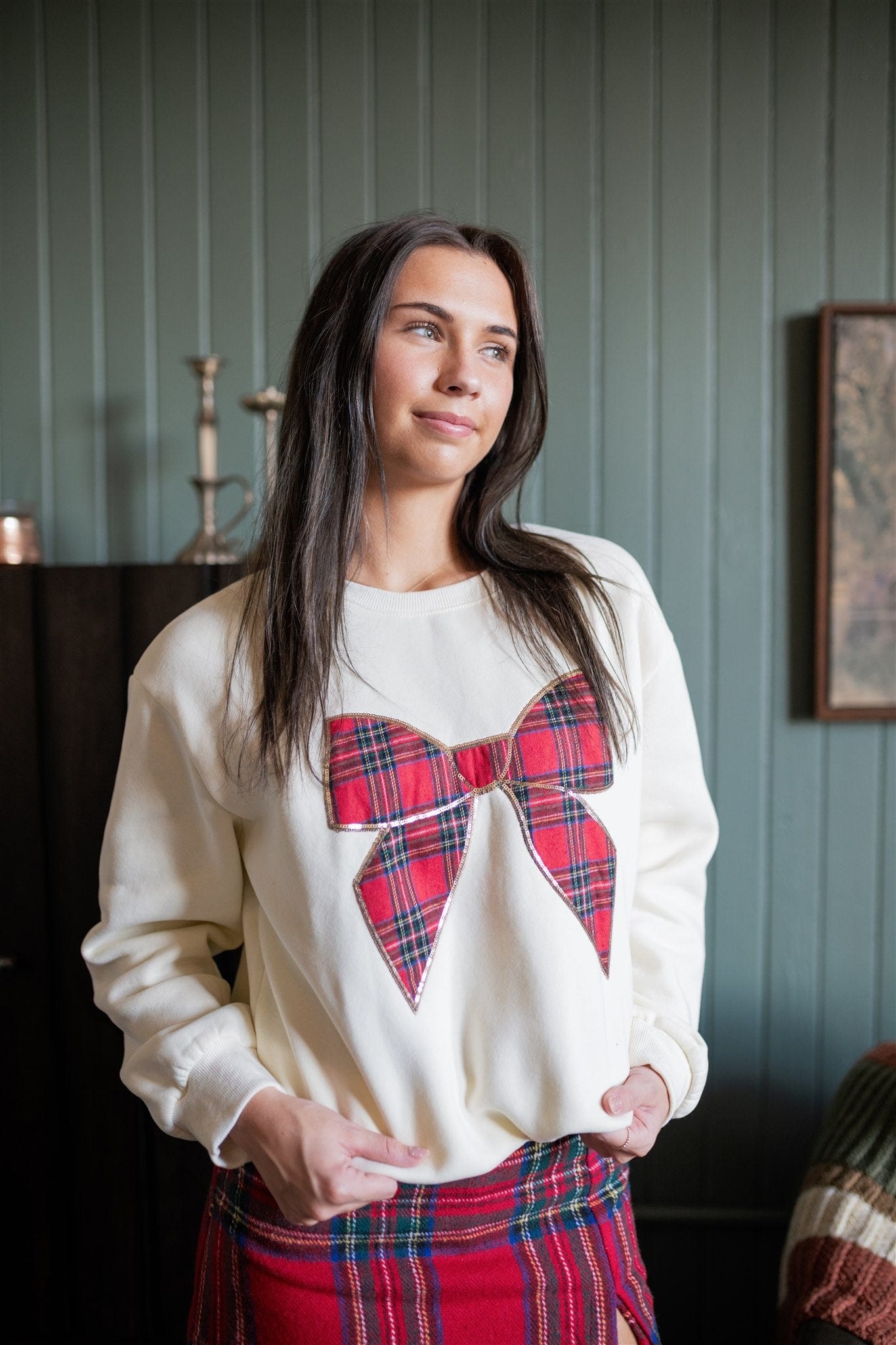 Celebrate the holiday season in cozy style with this Cream Christmas Bow Sweatshirt. Featuring a relaxed fit and long sleeves, it offers comfort for chilly days. The rounded neckline adds a classic touch, while festive Christmas plaid detailing and a charming bow on the front bring a cheerful holiday spirit to your wardrobe. Perfect for casual gatherings or festive outings, this sweatshirt combines comfort and seasonal flair effortlessly.