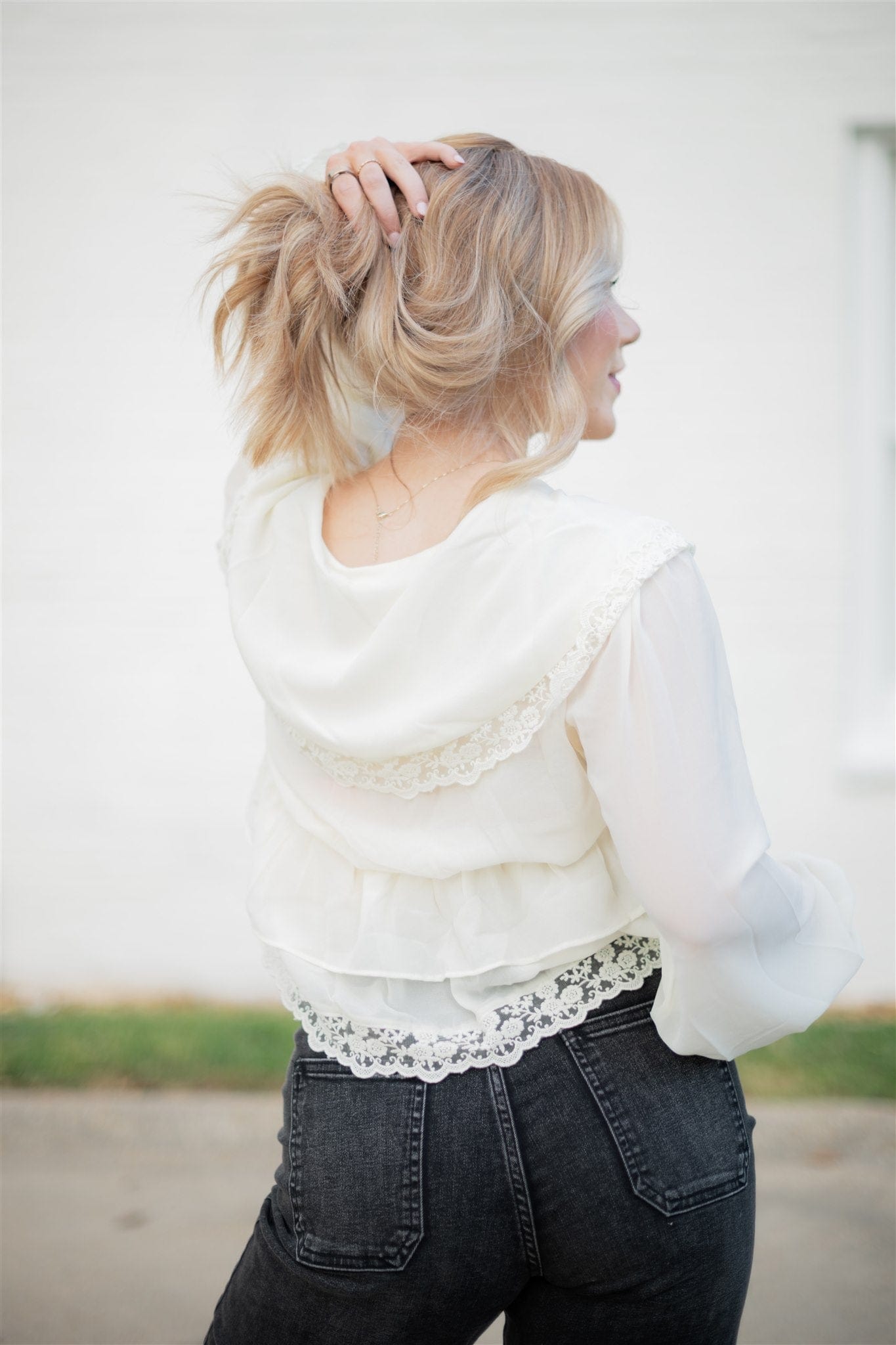 This Cream Lace Detail Chiffon Blouse combines timeless elegance with modern style. Featuring a delicate Peter Pan collar and a flattering V-neckline, it offers a refined look. The long puff sleeves add a soft, romantic flair, while the intricate lace detailing enhances its feminine charm. Made from lightweight, sheer, flowy chiffon, this blouse ensures comfort and grace for any occasion. Perfect for elevating both casual and dressy outfits with ease.