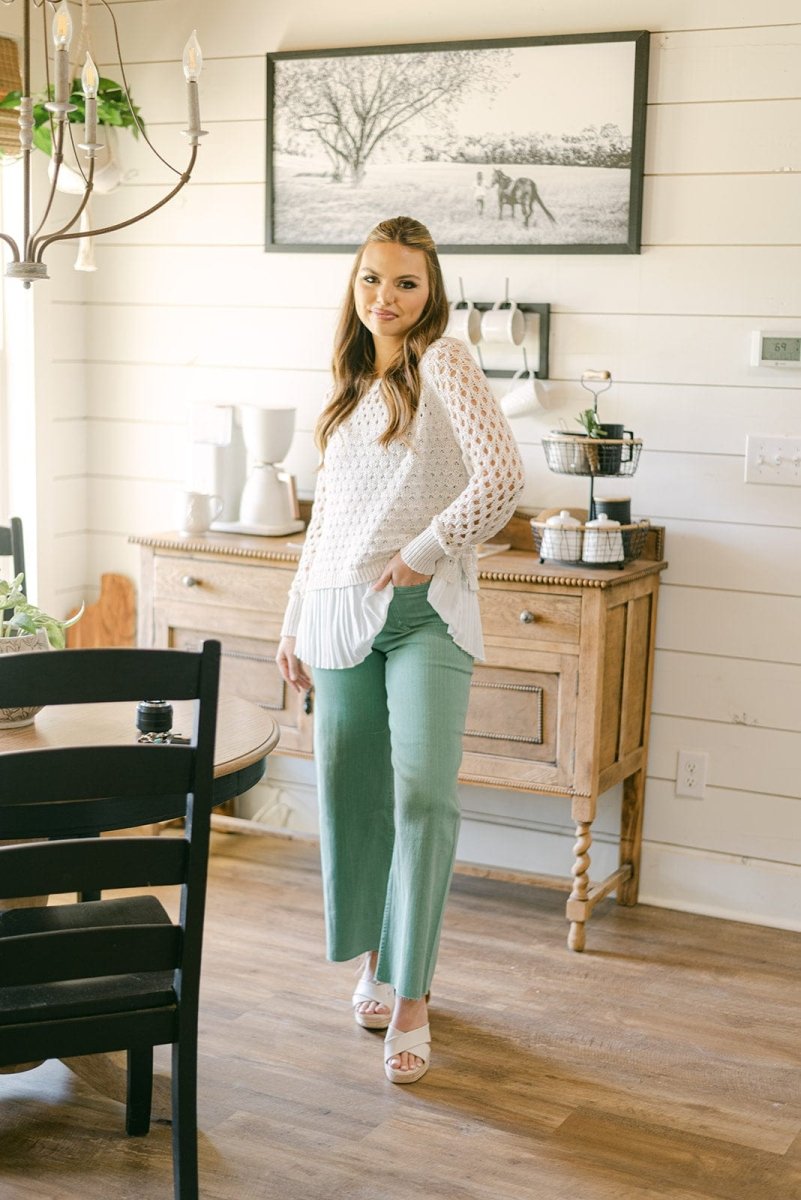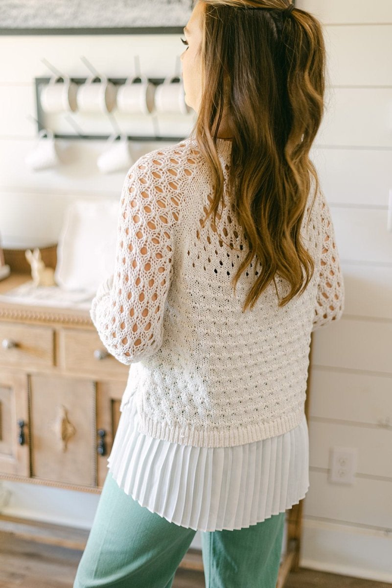 Elevate your spring wardrobe with our Cream & White Pleated Hem Knit Top! This stylish top features a rounded neckline and long sleeves, perfect for the transition into warmer weather. The pleated hem detail adds a touch of elegance, while the stretchy knit fabric ensures a comfortable fit. Experience effortless style and comfort in one with this must-have piece!