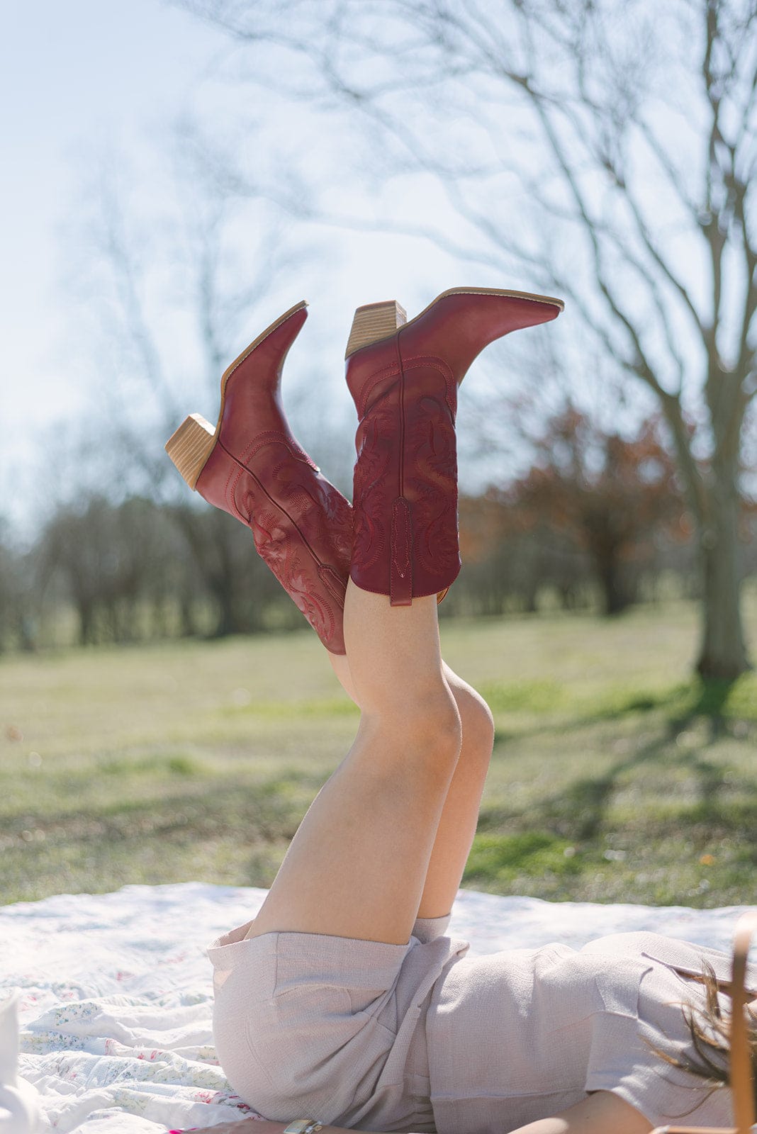 Complete your cowgirl look with our Deep Red Classic Cowgirl Boots. With a pointed toe and mid-calf length, these boots offer both style and comfort. The deep red color adds a bold touch to any outfit. Perfect for any adventures on the ranch or riding in the rodeo!