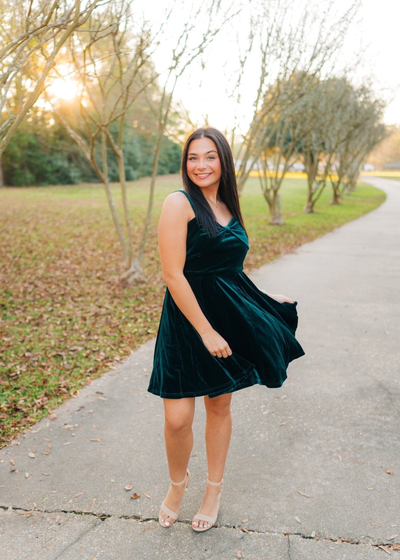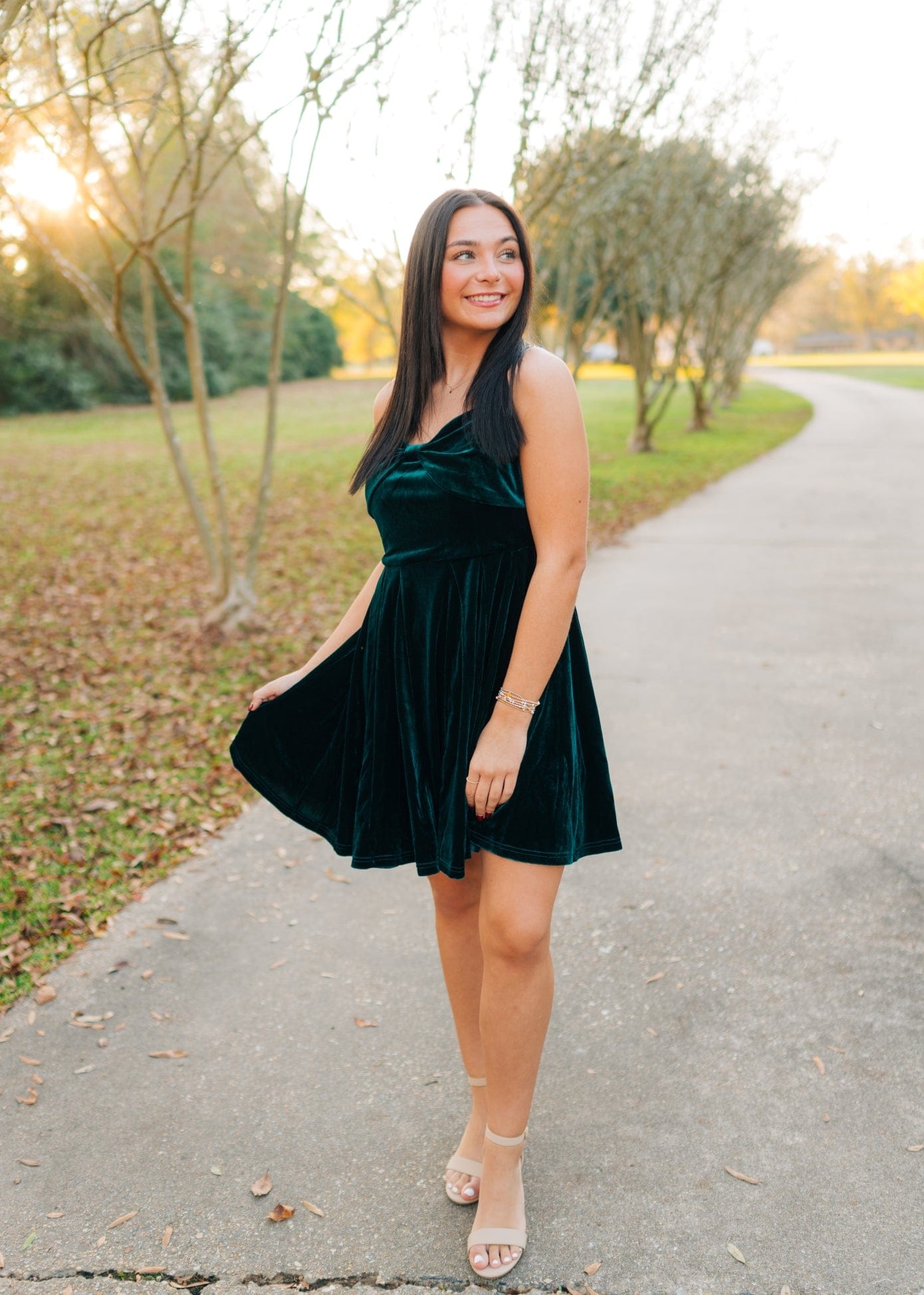Elevate your holiday wardrobe with this stunning green velvet mini dress that effortlessly blends elegance and playfulness. The sweetheart neckline and charming bow front detail create an instantly flattering silhouette, while the flowy fabric drapes beautifully for graceful movement. Adjustable straps ensure a custom fit, and the discreet back zip closure makes dressing a breeze. Perfect for festive gatherings, date nights, or any occasion calling for sophisticated style with a touch of whimsy.