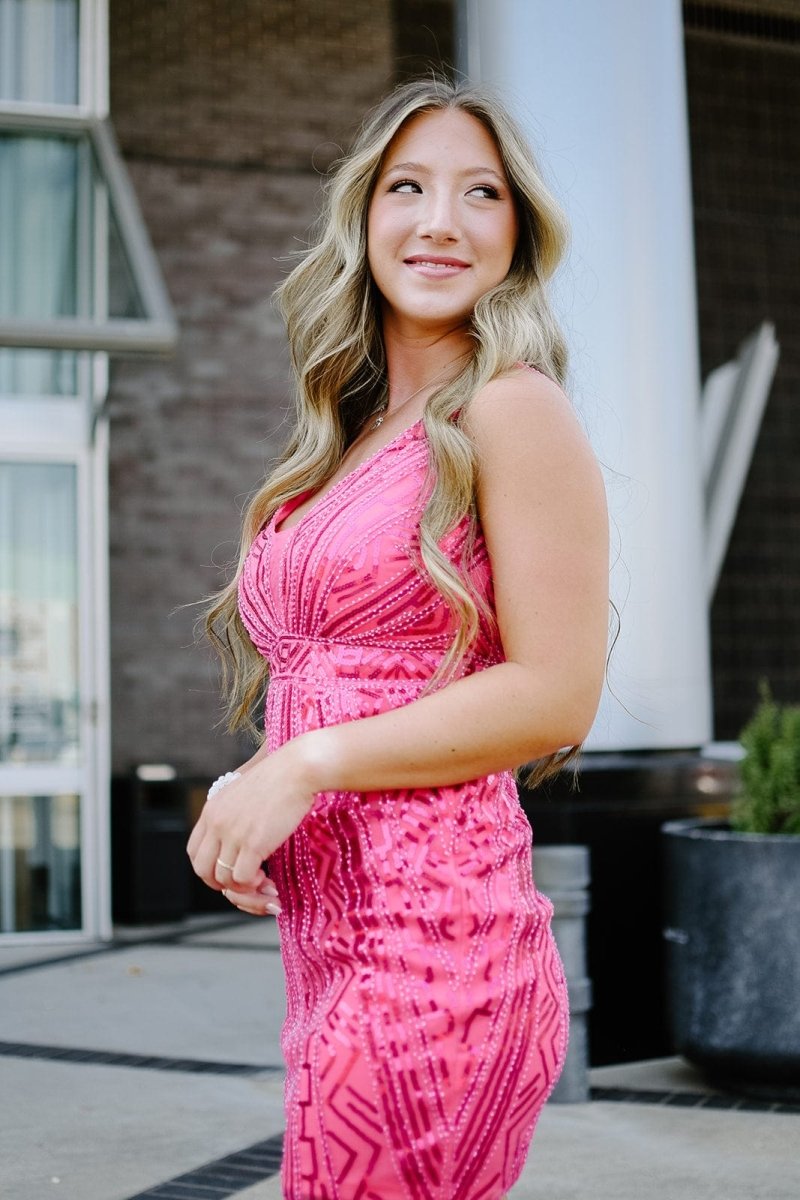 The Hot Pink Beaded Sequin Cocktail Dress is a dazzling and vibrant garment designed to capture attention and radiate confidence with the shimmer of intricate bead and sequin embellishments....perfect for your next dance or party.