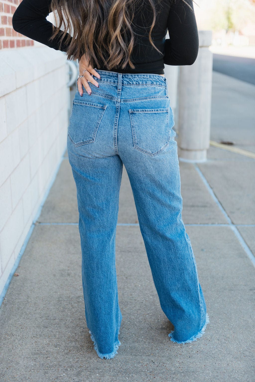 Experience comfort and style with Jelly Jeans High Rise Wide Leg. These medium washed denim blue jeans boast a frayed hem and subtle whisker detail, adding a touch of edginess to any outfit. Make a statement with these must-have jeans that will elevate your wardrobe! RISE: 11 1/2" INSEAM: 33" 99% Cotton 1% Spandex