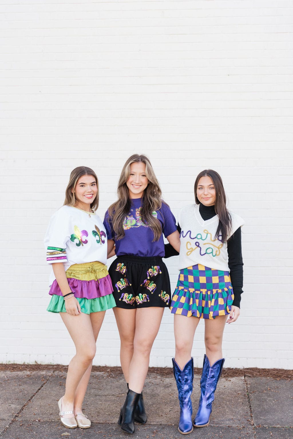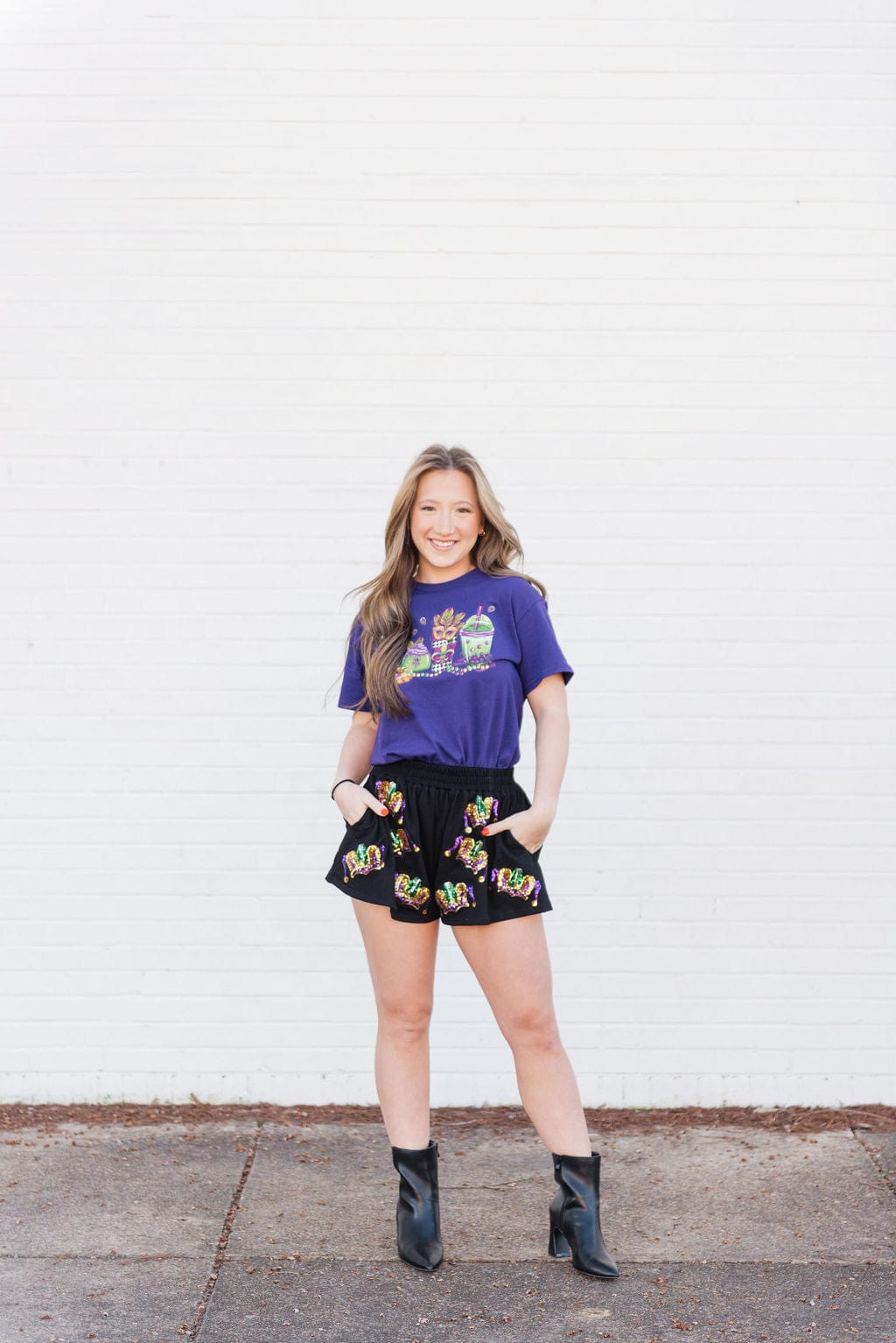 Embrace your inner royalty in our Mardi Gras Sequin Tiara Shorts! These shimmering, stretchy shorts feature a high-waisted design, an elastic waistband, and luxurious sequins that will make you feel like a true Queen. Sparkling dance floors await! Seasonal Items are a final sale, exchange only.