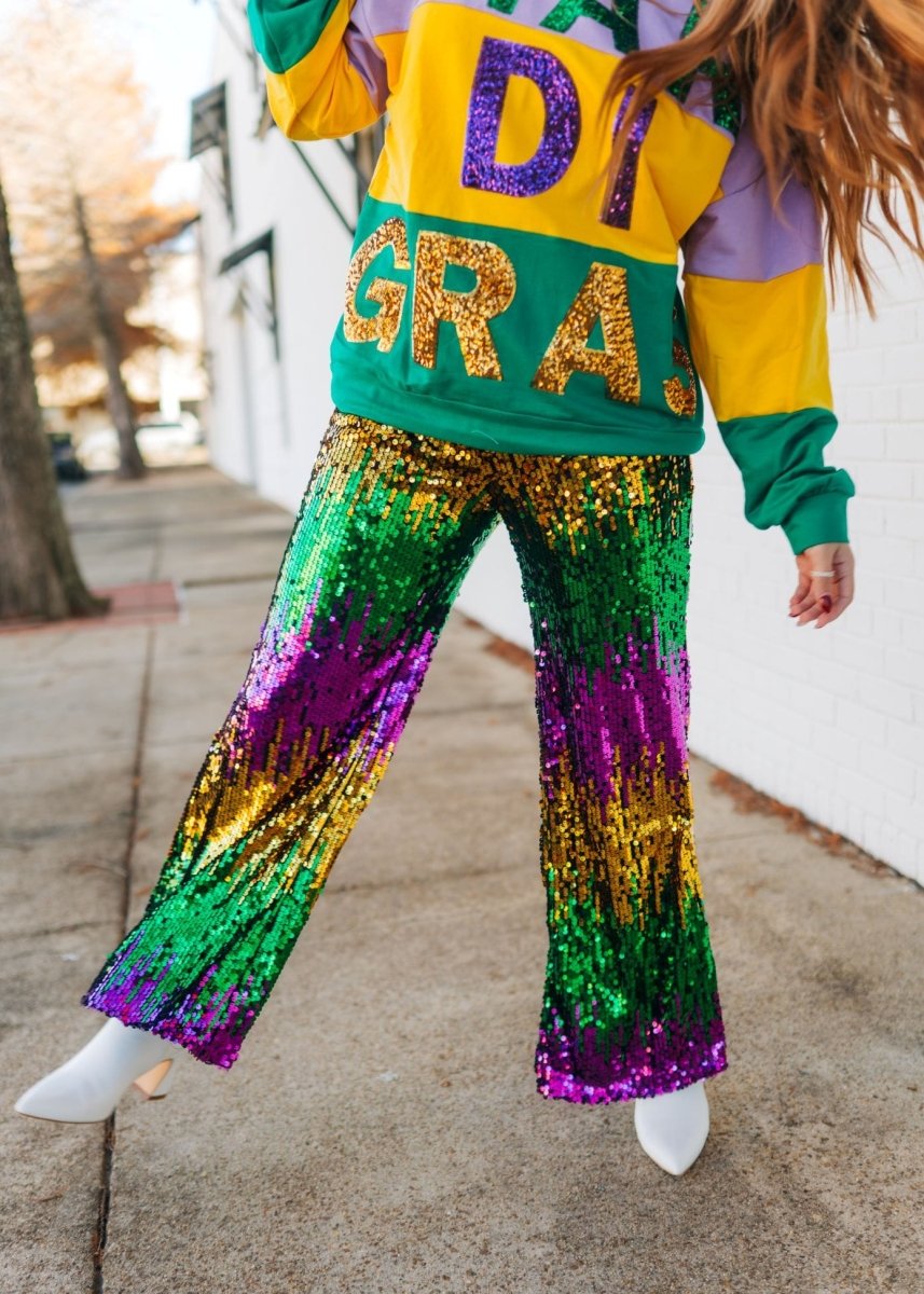 Celebrate in style with these show-stopping Mardi Gras Sequin Wide Leg Pants. Crafted in festive purple, green, and gold sequins, they deliver maximum sparkle and eye-catching glamour for any celebration. The high-waisted silhouette flatters your figure while the stretchy fabric ensures all-night comfort and freedom of movement. Wide-leg styling creates a bold, confident look that commands attention. Perfect for Mardi Gras festivities, themed parties, or anyone ready to turn heads with sequined sophistication.