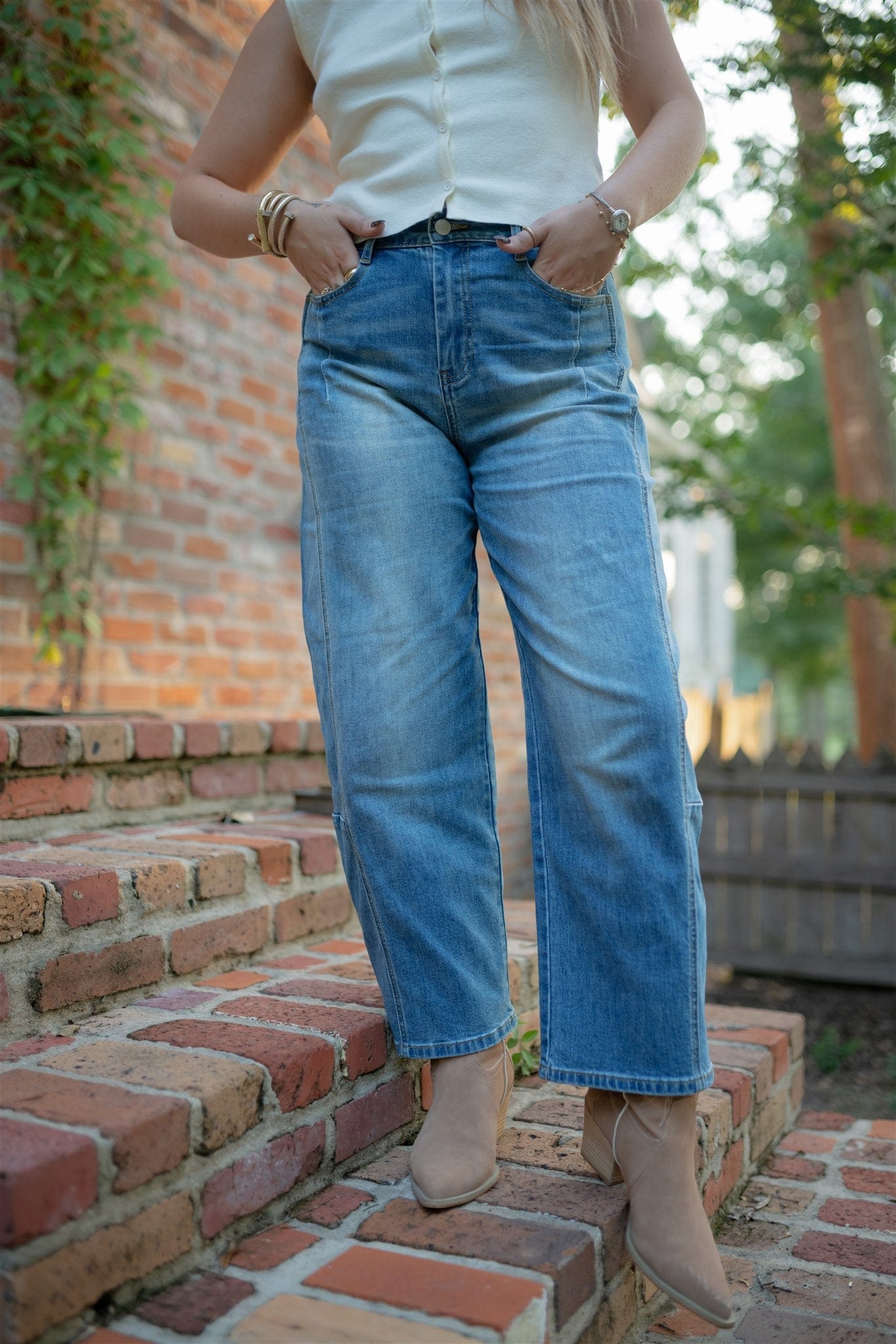 Experience the perfect blend of comfort and style with these medium wash, mid-rise barrel jeans. Their loose fit and trendy silhouette make them an ideal choice for fall, offering both ease of movement and a fashionable edge. Crafted from quality denim, these jeans are versatile enough to elevate any casual outfit while keeping you comfortable all day long.