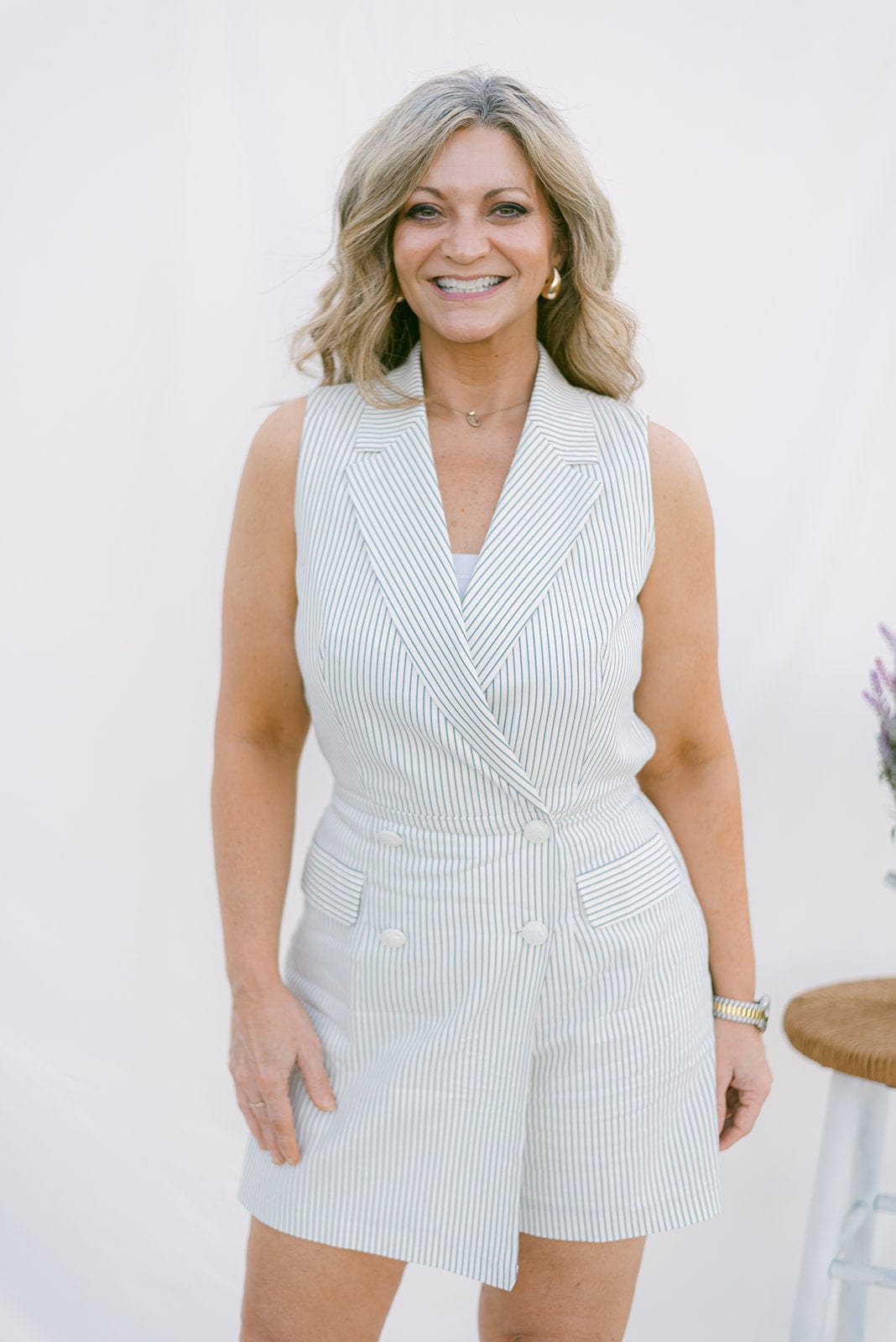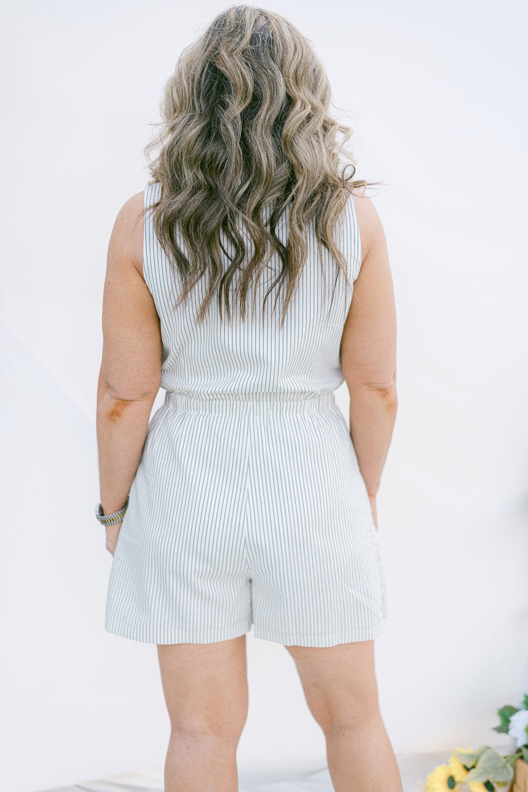 Upgrade your wardrobe with our Navy Pinstriped Sleeveless Romper. Featuring a v-neckline and collar, this romper adds a touch of sophistication to your style. The cream with navy pinstripe design and button detail make it versatile for any occasion. Stay effortlessly chic with this must-have piece!