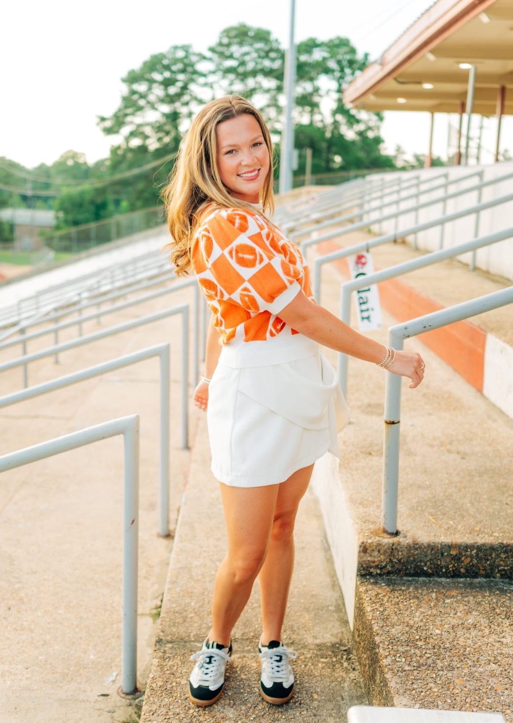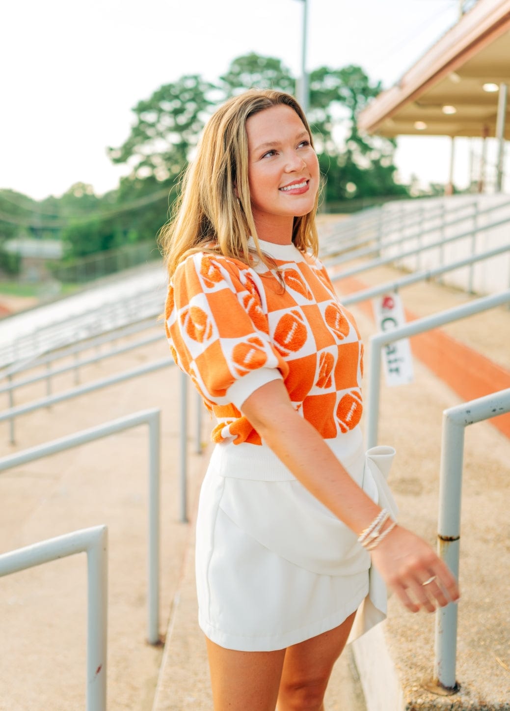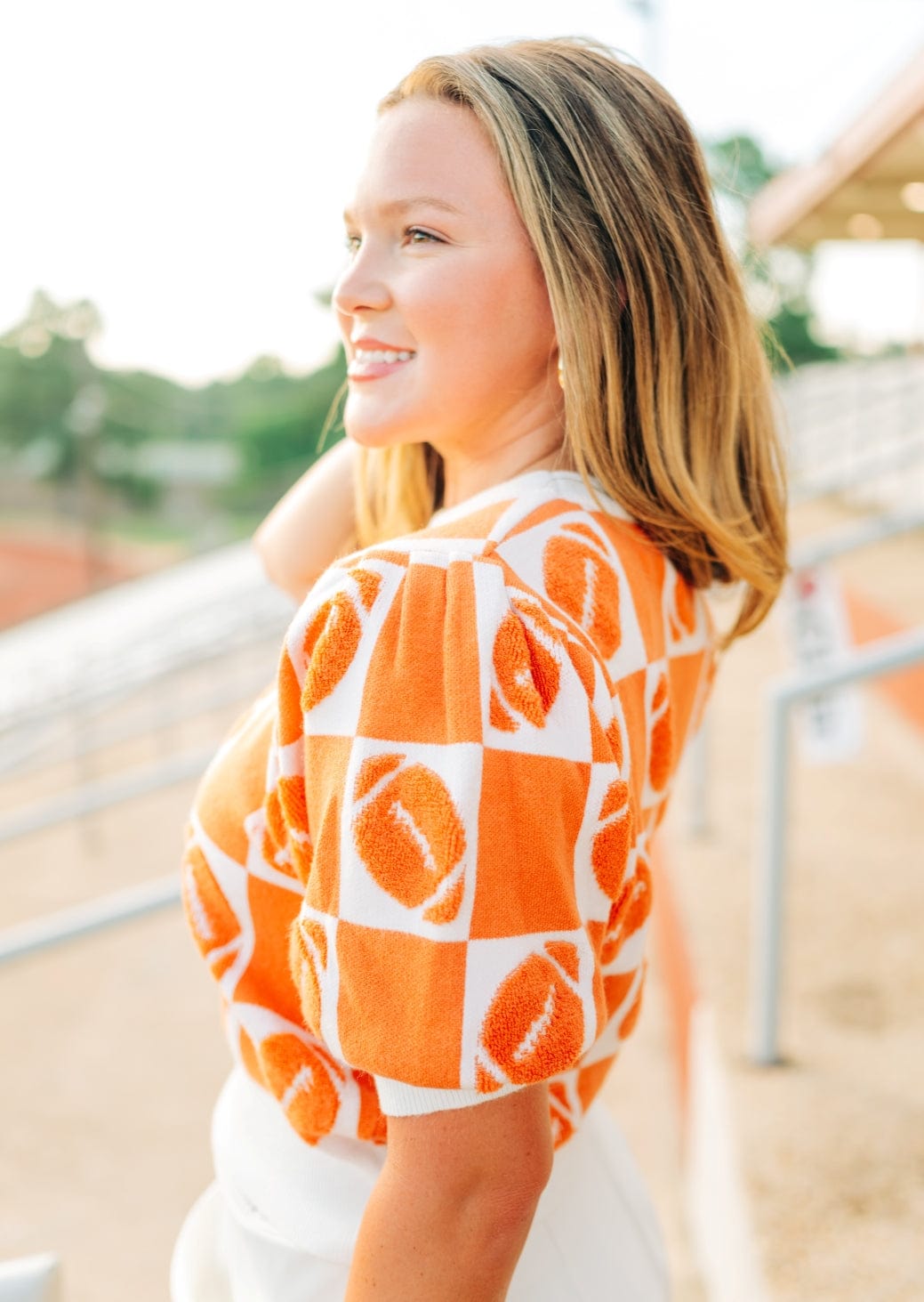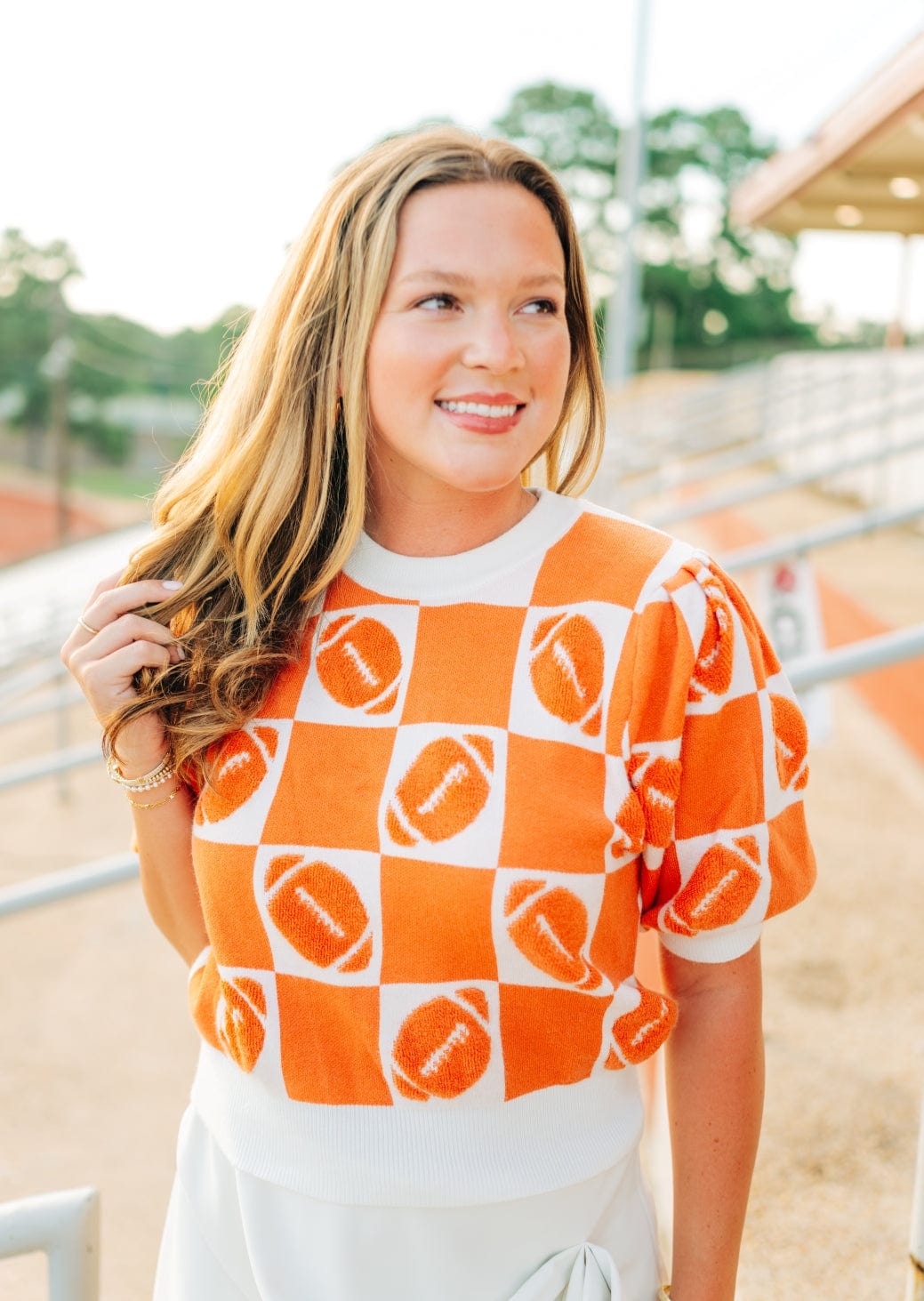 Elevate your game in the Orange Football Checker Knit Top. With a flattering rounded neckline and playful short puff sleeves, this knit top exudes both comfort and style. The football checkered pattern adds a touch of sporty charm while the stretchy fabric ensures a perfect fit. Complete with a cropped hem in a vibrant orange hue, this top is a must-have for any fashion-forward athlete.