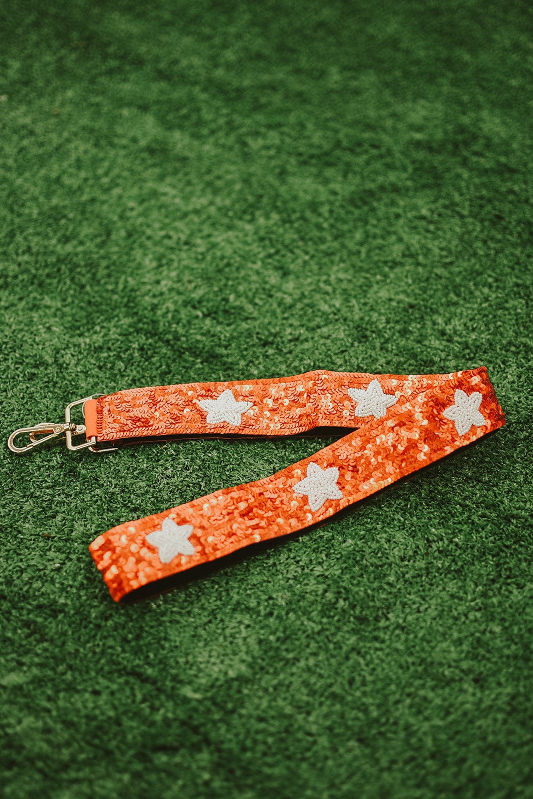 Make a statement with this sparkling eye-catching Tennessee Orange Sequin Bag Strap! Perfect for football fans, the Tennessee Gameday or Florida Gators Gameday-inspired orange background with white beaded star detail is sure to spark conversation. Don't sacrifice style for durability; this bag strap is durable and lightweight. Take your bag from ordinary to extraordinary!