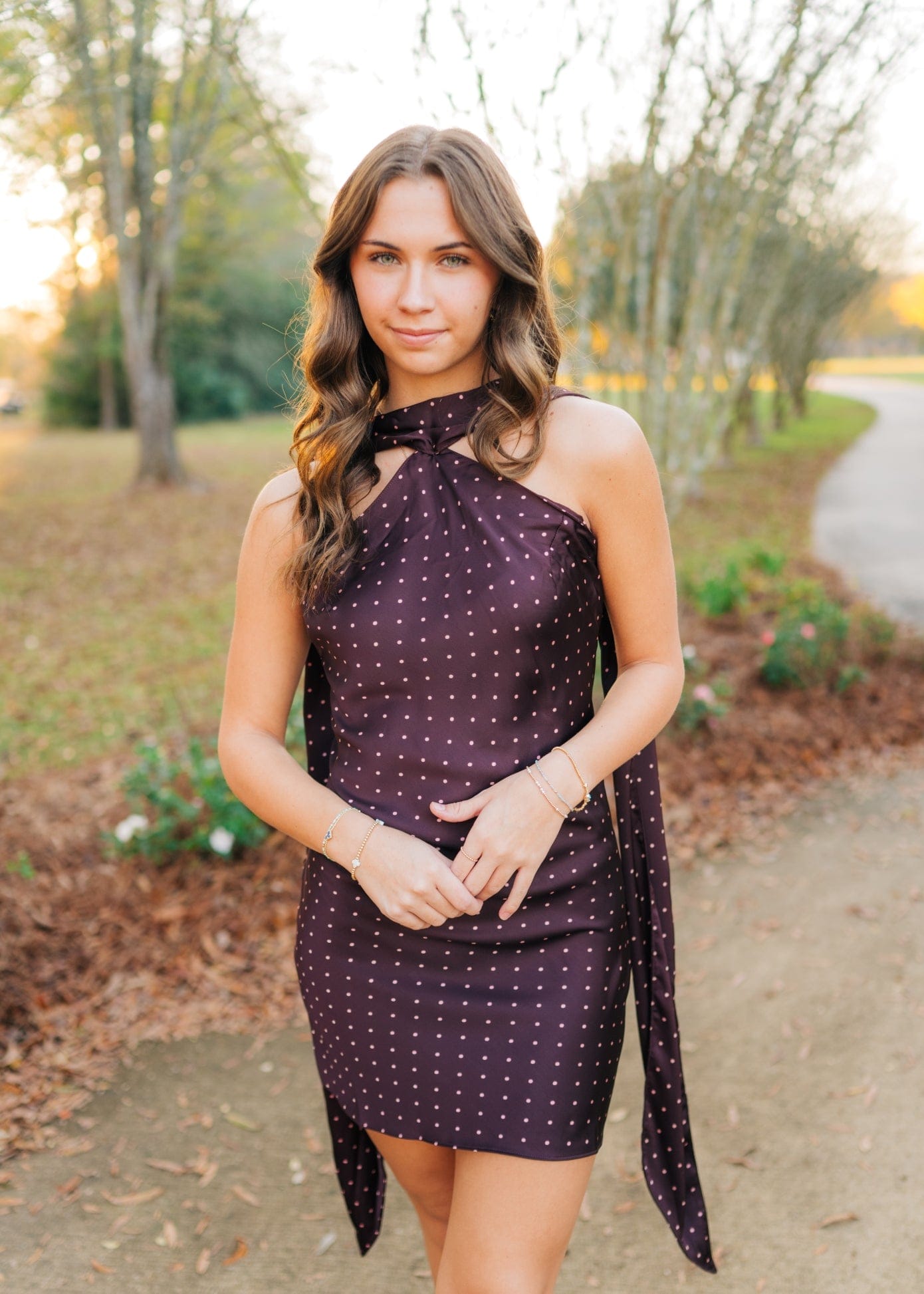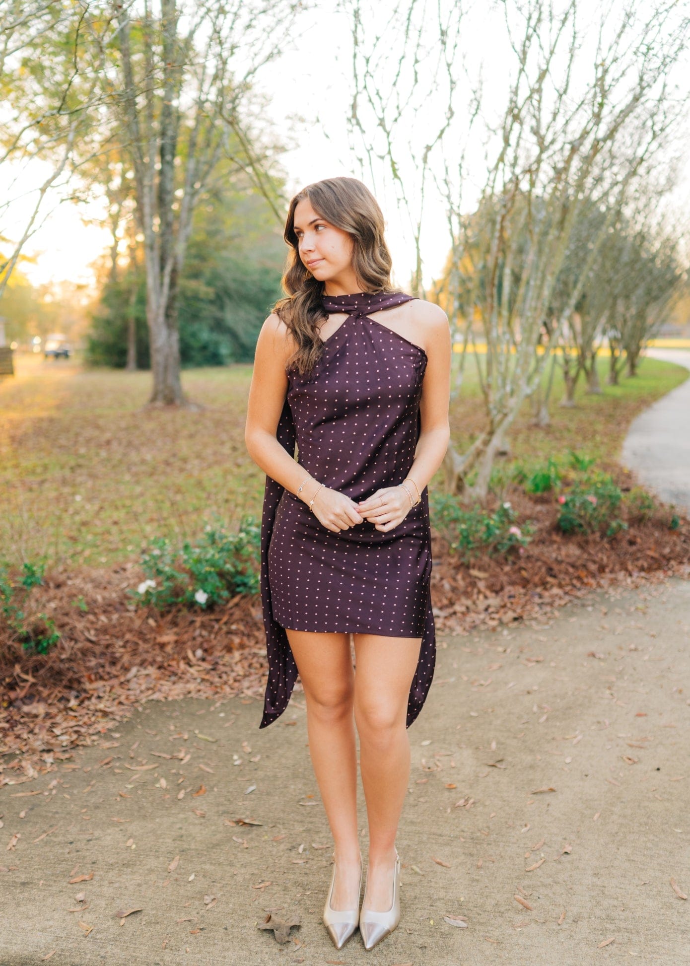 Elevate your evening look with the Penny Burgundy Polka Dot Scarf Dress—a sophisticated mini that commands attention. The rich burgundy satin base features charming white polka dots, while an elegant halter neckline and adjustable straps ensure a custom fit. A signature scarf detail adds playful movement and dimension, and the convenient side zip closure makes dressing effortless. Perfect for date nights, cocktail events, or whenever you want to feel polished and put-together.