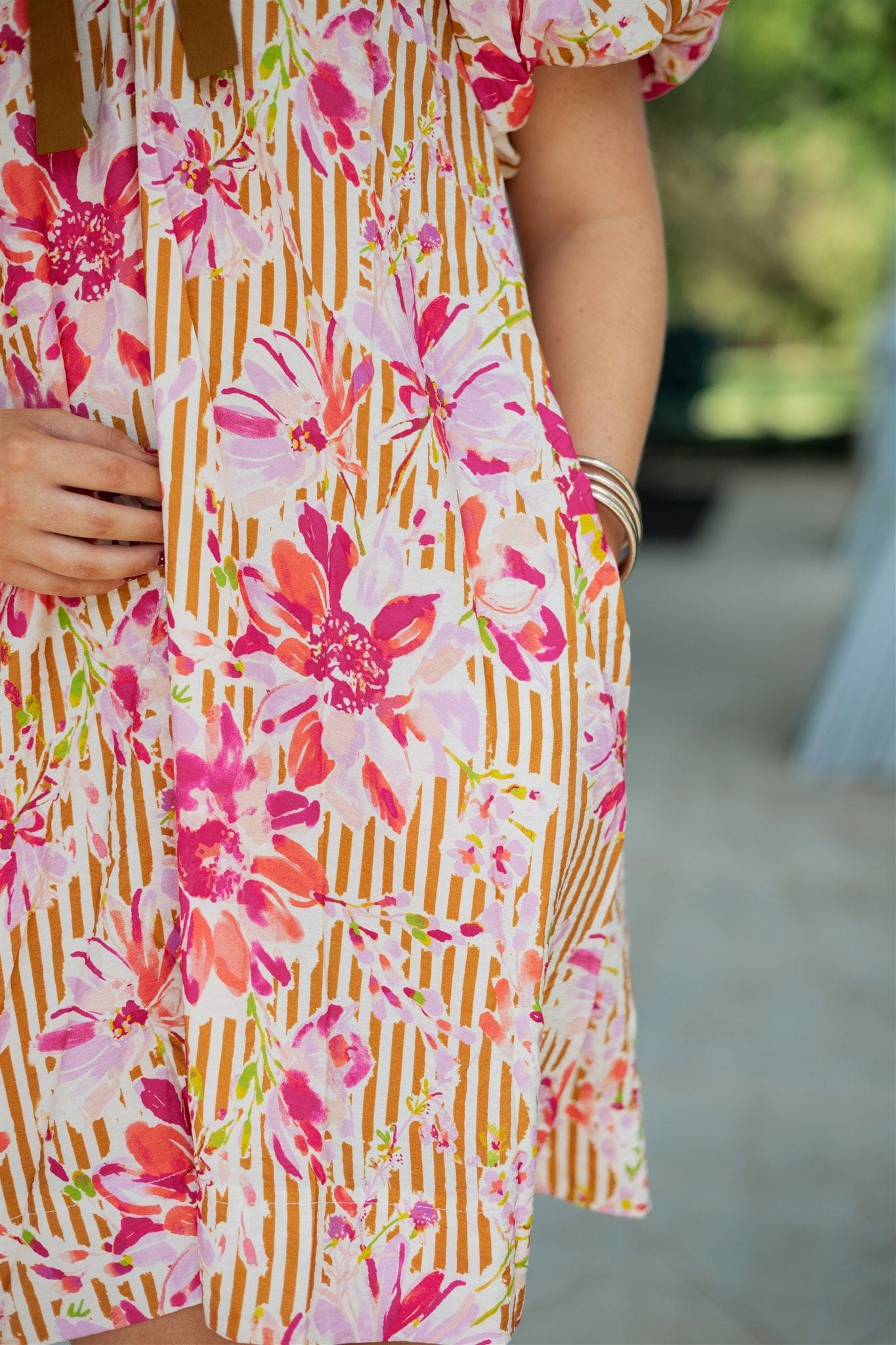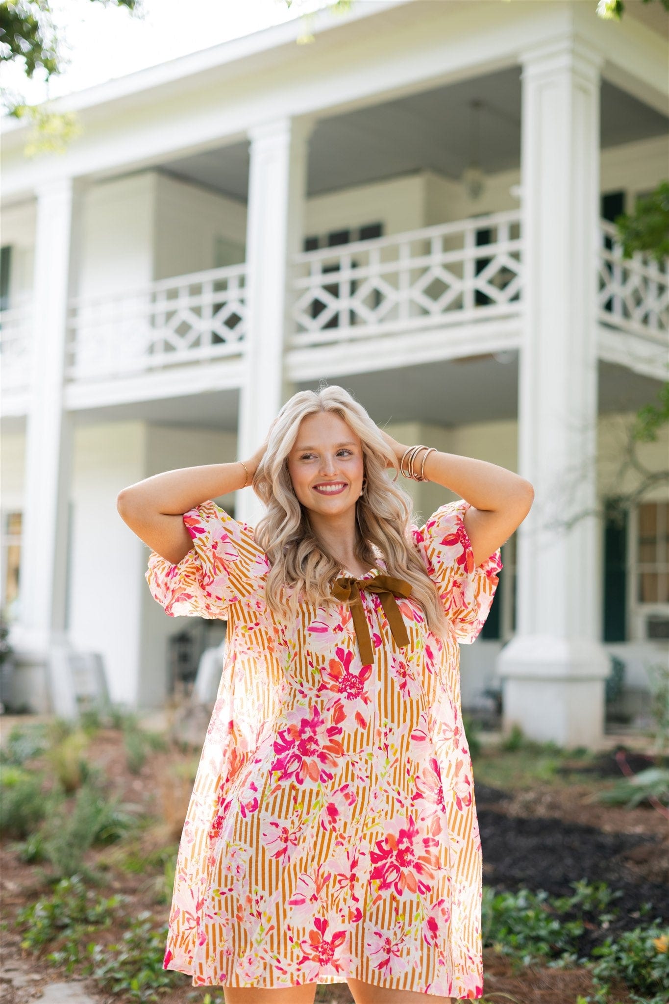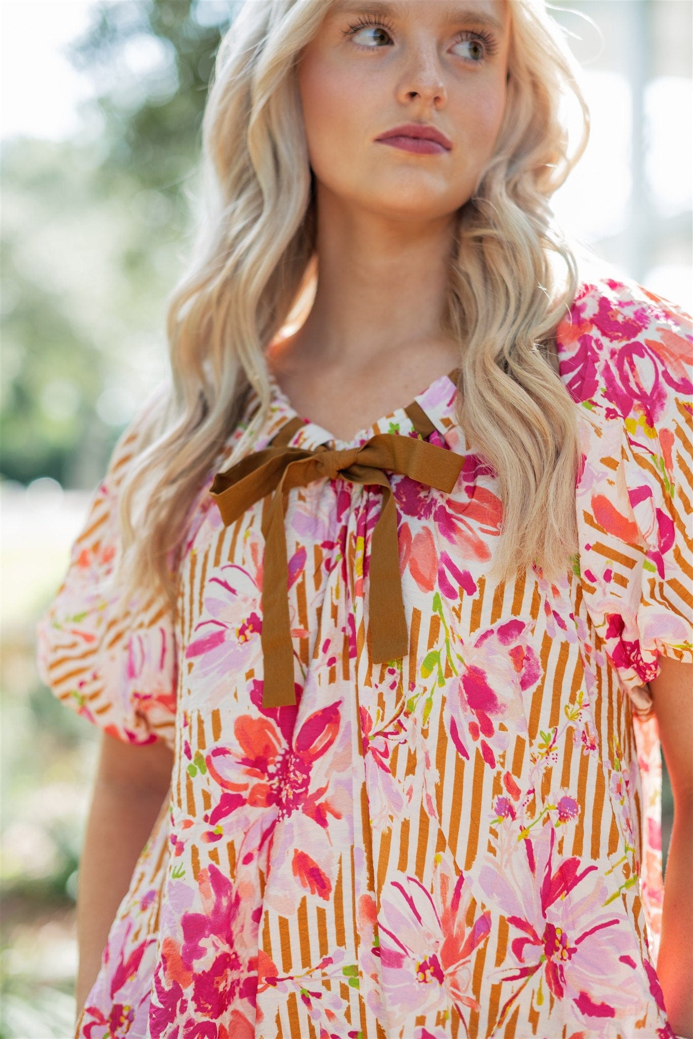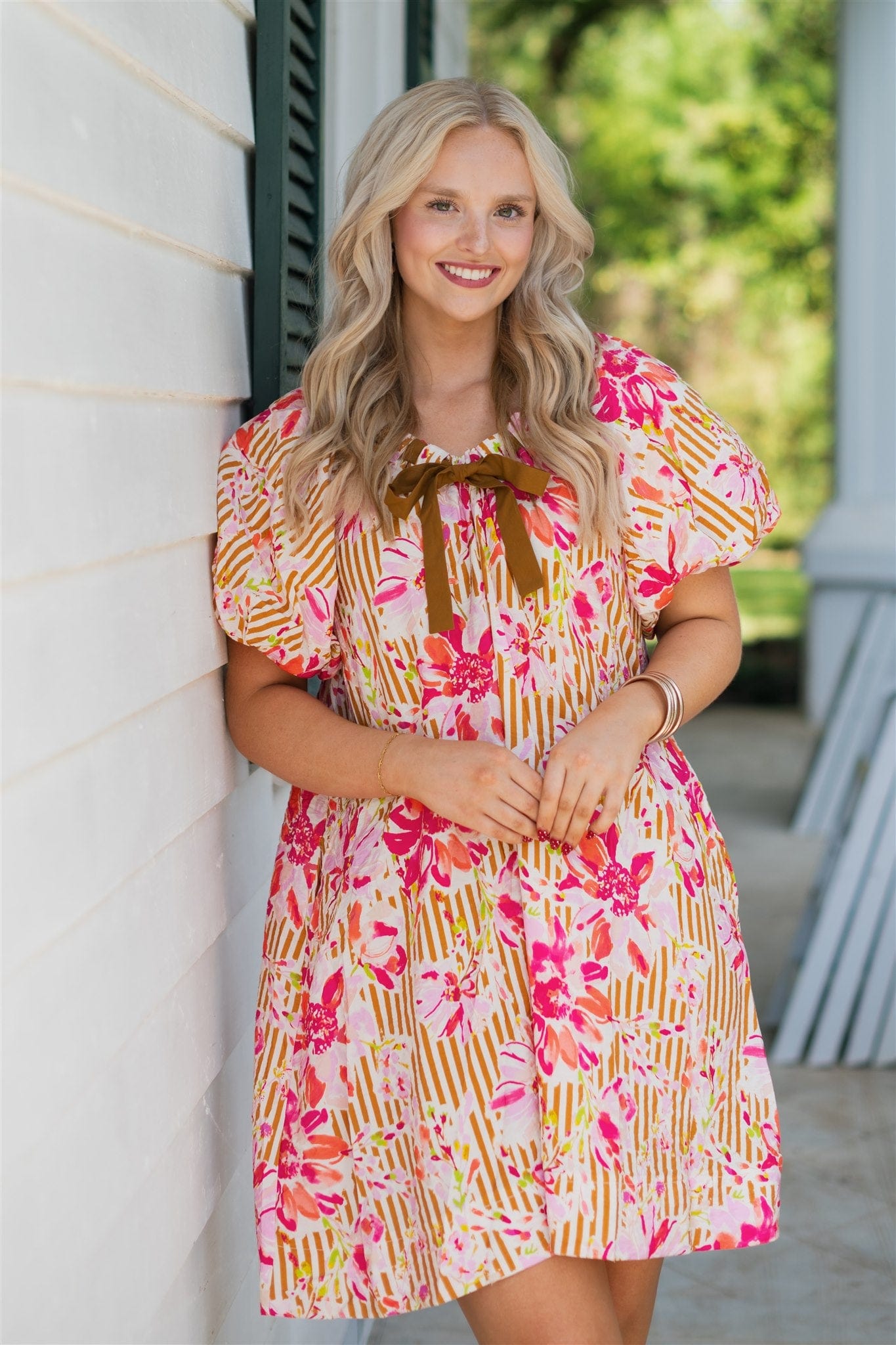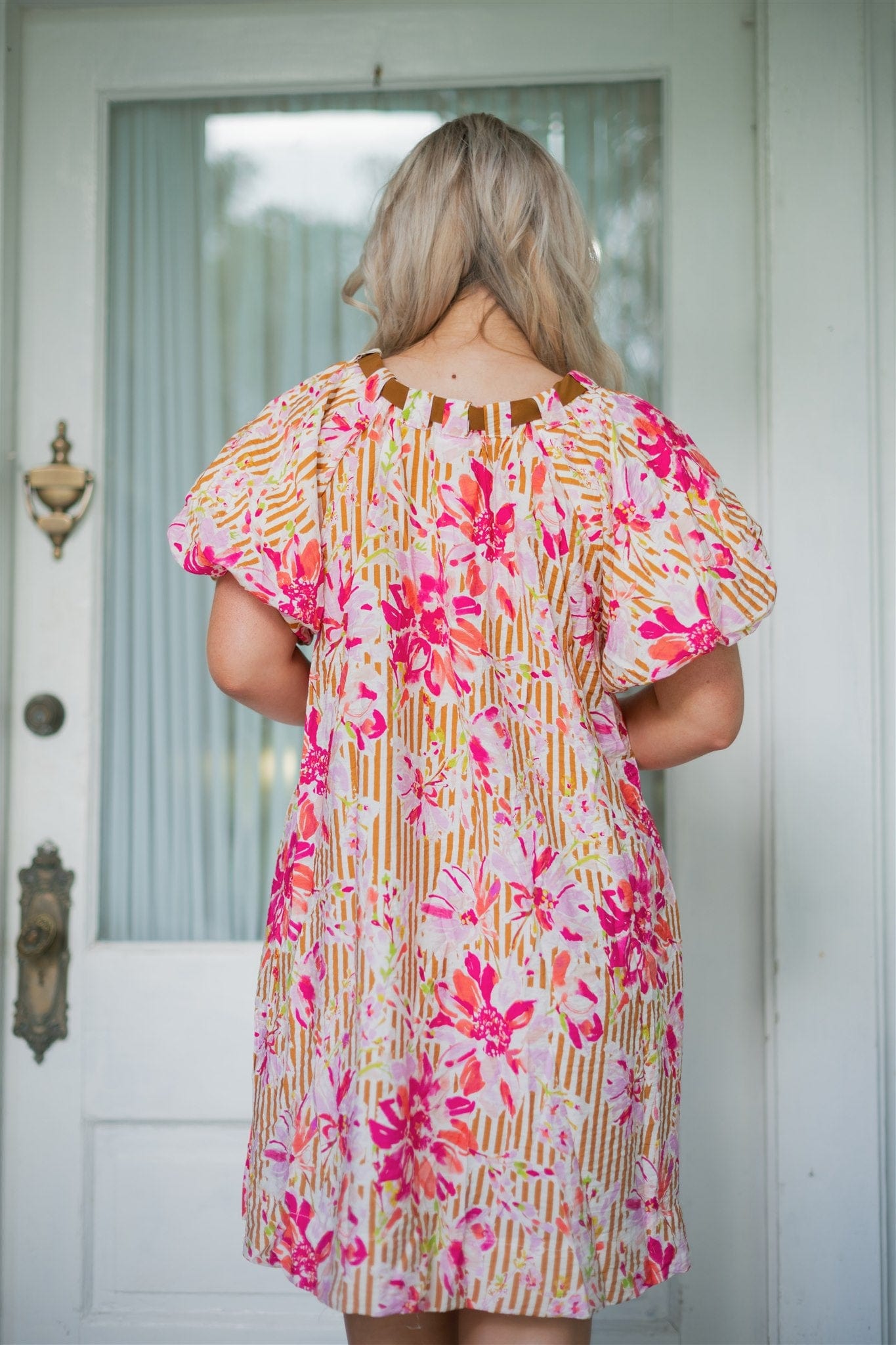 Embrace the season’s shift with this pink and taupe floral mini dress, designed to flow effortlessly for all-day comfort. Its scoop neck and short puff sleeves add a charming, feminine touch, while the lightweight fabric makes it perfect for Fall transitions. Whether layered or worn alone, this dress combines delicate style with versatile ease, making it a must-have for your wardrobe.