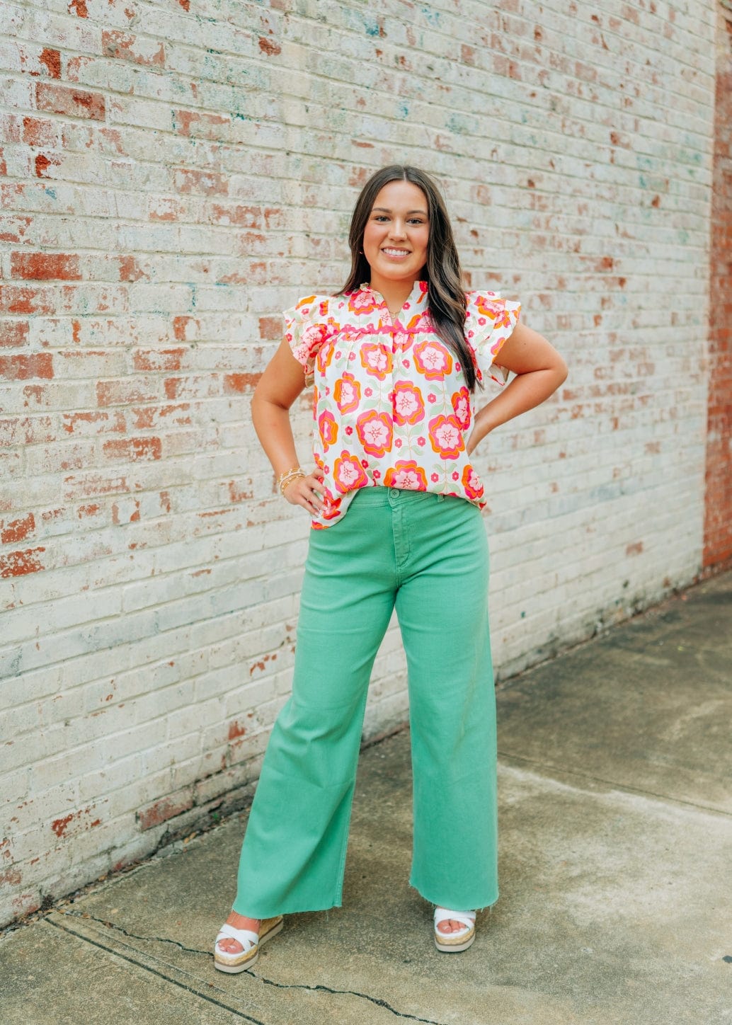 This pink floral blouse features delicate ruffle short sleeves and a flattering V-neckline, creating a feminine and airy look. The flowy fabric drapes beautifully, while the charming ricrac trim adds a subtle touch of vintage-inspired detail. Perfect for warm days or layering, this blouse effortlessly combines comfort and style for a fresh, elegant wardrobe staple.