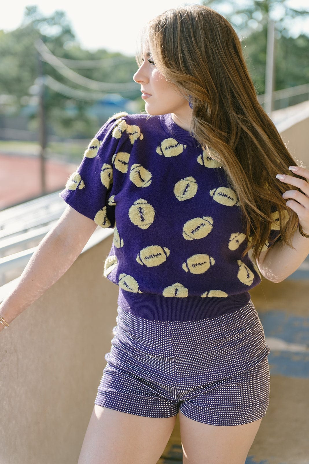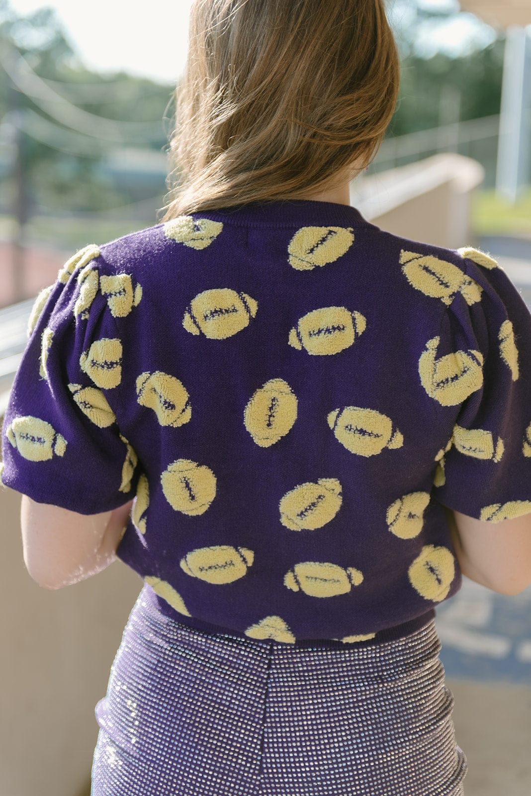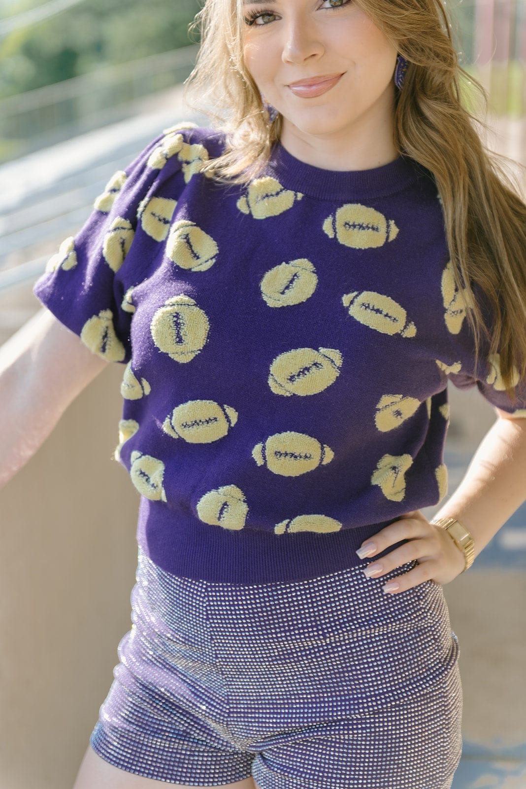 Be game day ready with our Purple Football Pattern Knit Top! This soft, knit top features a vibrant purple and yellow football pattern, perfect for showing your support for LSU. With a rounded neckline, short puff sleeves, and a cropped hem, this top is both comfortable and stylish for any gameday event.