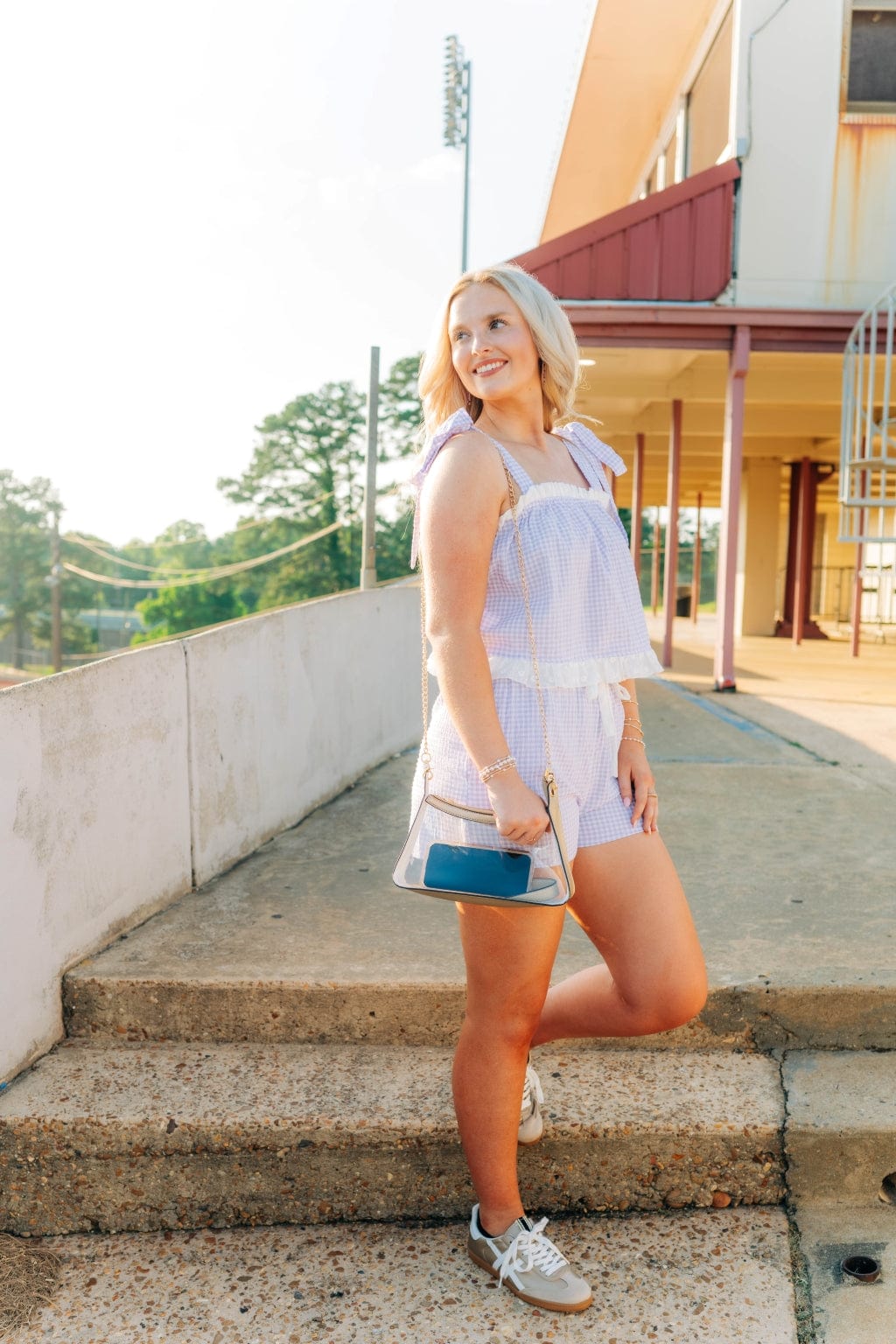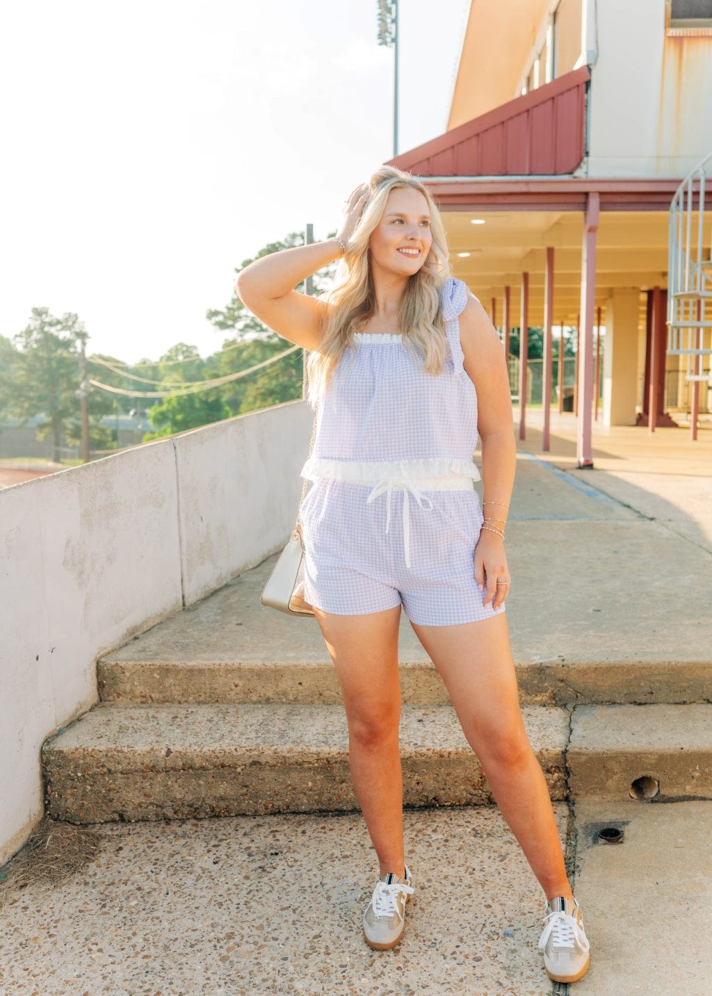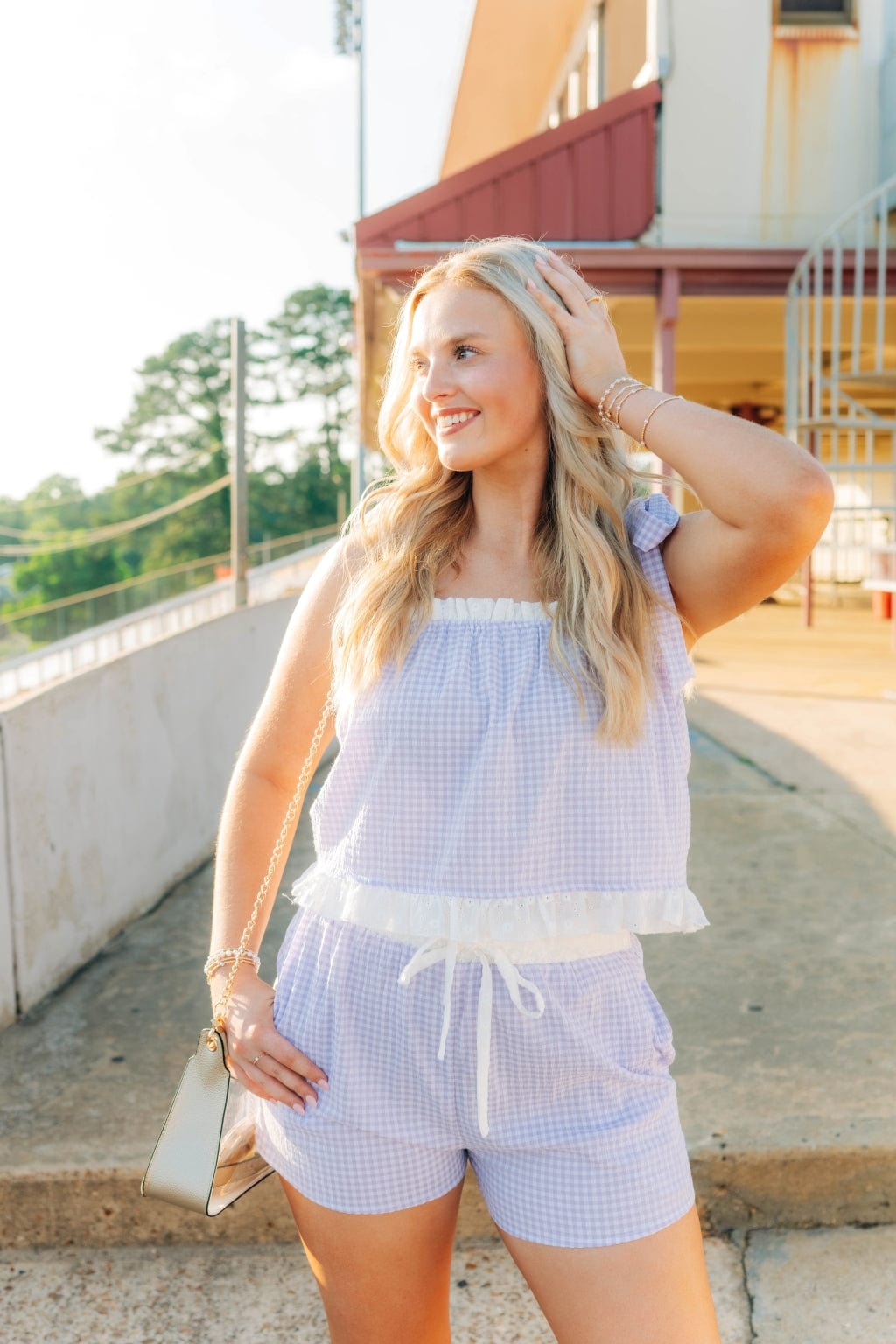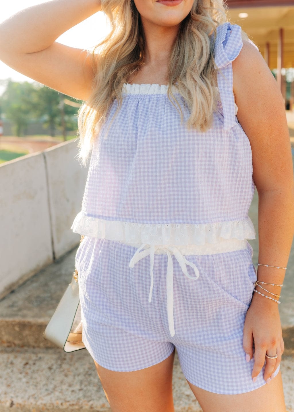 Experience ultimate comfort and style in our Purple Gingham Ruffle Trim Short Set. Featuring eye-catching gingham and delicate eyelet lace detail, this set is perfect for a casual day out. The ruffle trim, shoulder tie, and square neckline add a touch of femininity, while the stretchy, drawstring shorts provide a comfortable and flattering fit. Upgrade your wardrobe with this must-have set today!