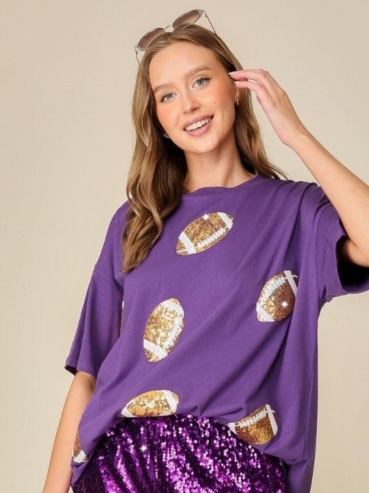 This is the perfect gameday Purple Sequin Football Tee! The oversized fit is ideal for lounging or game day fun, while the sparkling sequin footballs add a touch of playful sparkle to your look. Score major style points wherever you go!