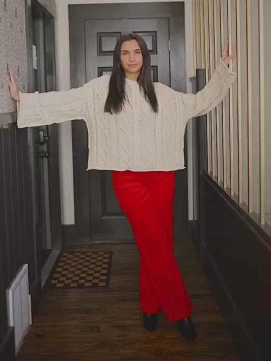 Elevate your holiday wardrobe with these red, high-waisted corduroy wide leg pants. Designed with a stretchy fabric, they offer both comfort and a flattering fit that moves with you. The bold red color and wide-leg silhouette create a stylish statement perfect for festive occasions or casual outings. Combining cozy texture with a chic design, these pants are your go-to piece for standing out effortlessly this season.
